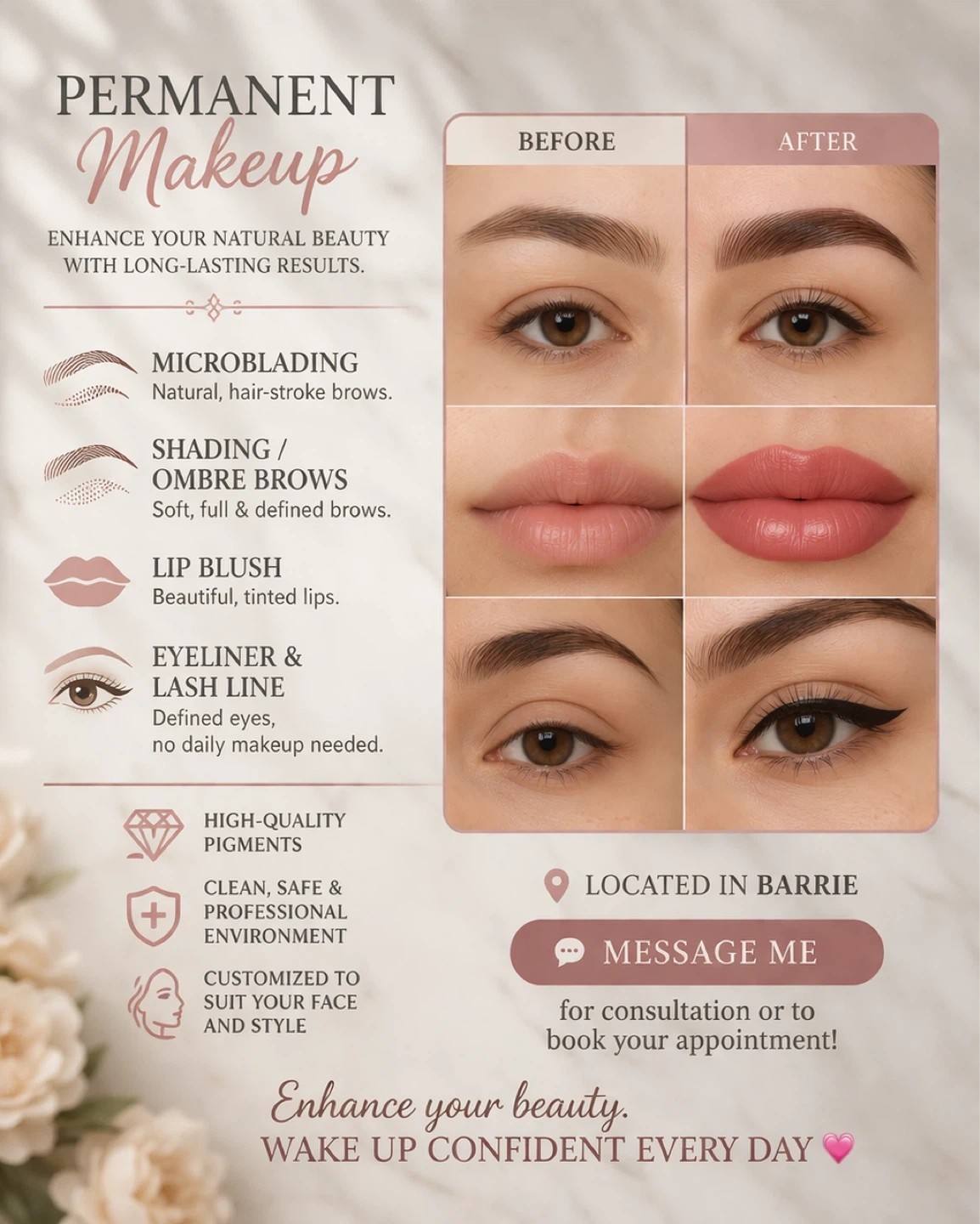 Enhance your natural beauty with long-lasting permanent makeup services. Specializing in microblading for natural brows, lip blush for beautiful tinted lips, and eyeliner for defined eyes. High-quality pigments used in a clean, safe, and professional environment. Located in Barrie for consultations and appointments.