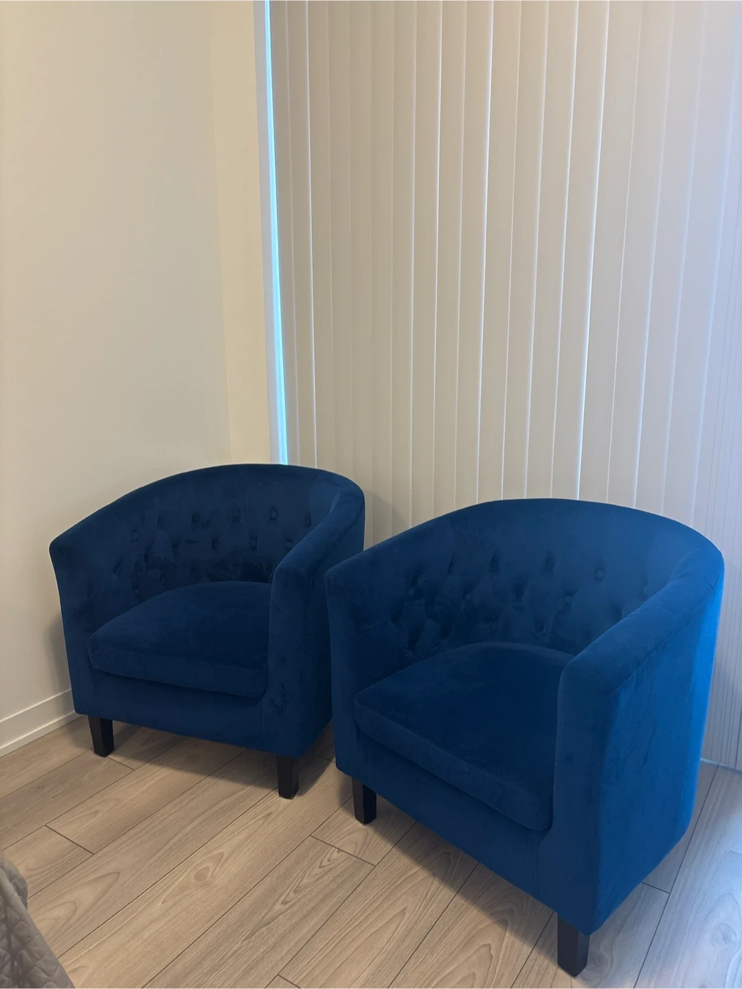 Two plush blue velvet accent chairs with tufted backs. They're perfect for adding a touch of elegance to any living space. Upholstered in soft velvet material. These chairs would be a stylish addition to a living room or bedroom!