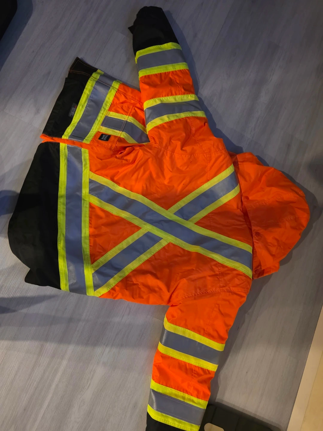 This orange high-visibility work jacket is designed for safety. It features reflective stripes and a durable construction for enhanced visibility in various work environments. Zip closure with a storm flap ensures extra protection.
