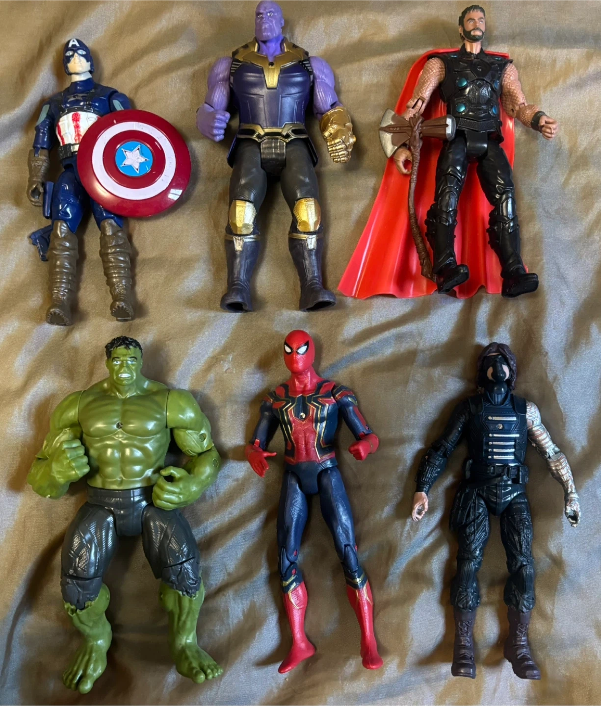 This is a lot of Marvel Avengers action figures. Includes Hulk, Spider-Man, Winter Soldier, Captain America with shield, Thanos, and Thor. Some figures light up!