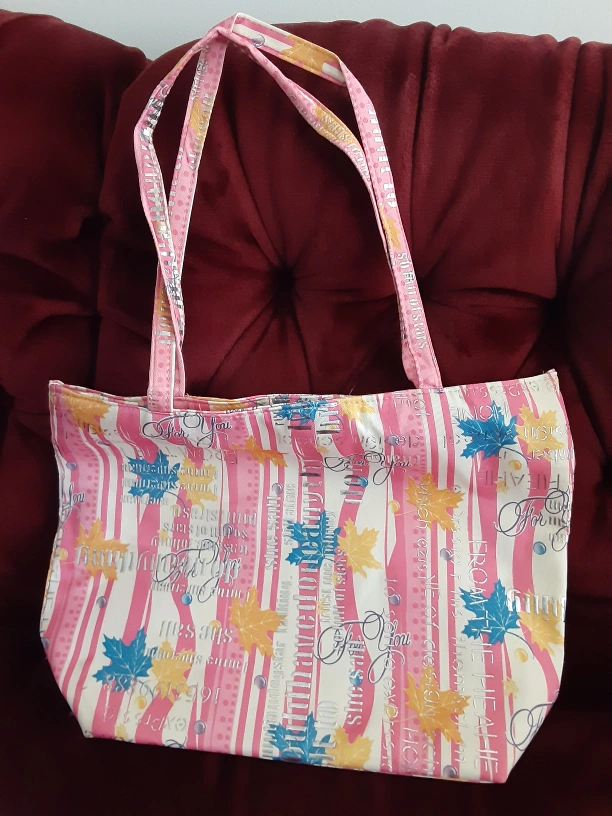 Large tote bag with pink, white, and yellow stripes. Features a leaf pattern and a silver design.