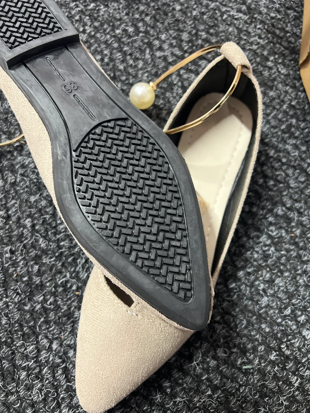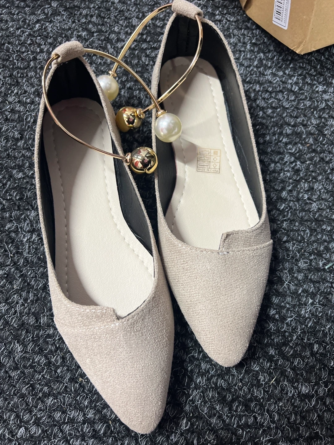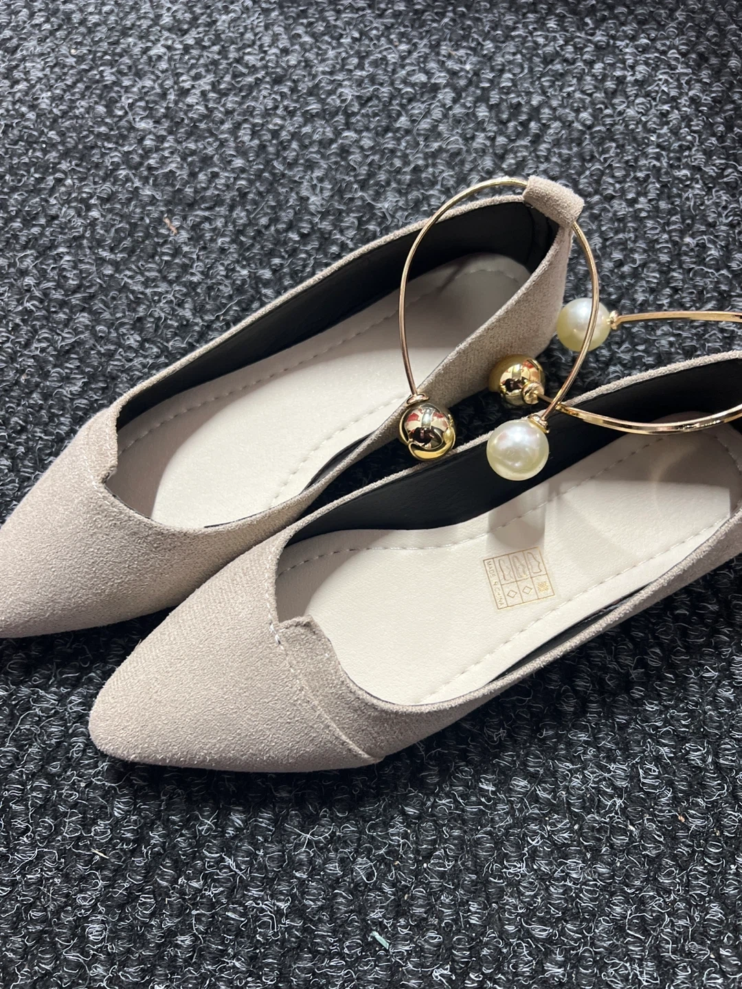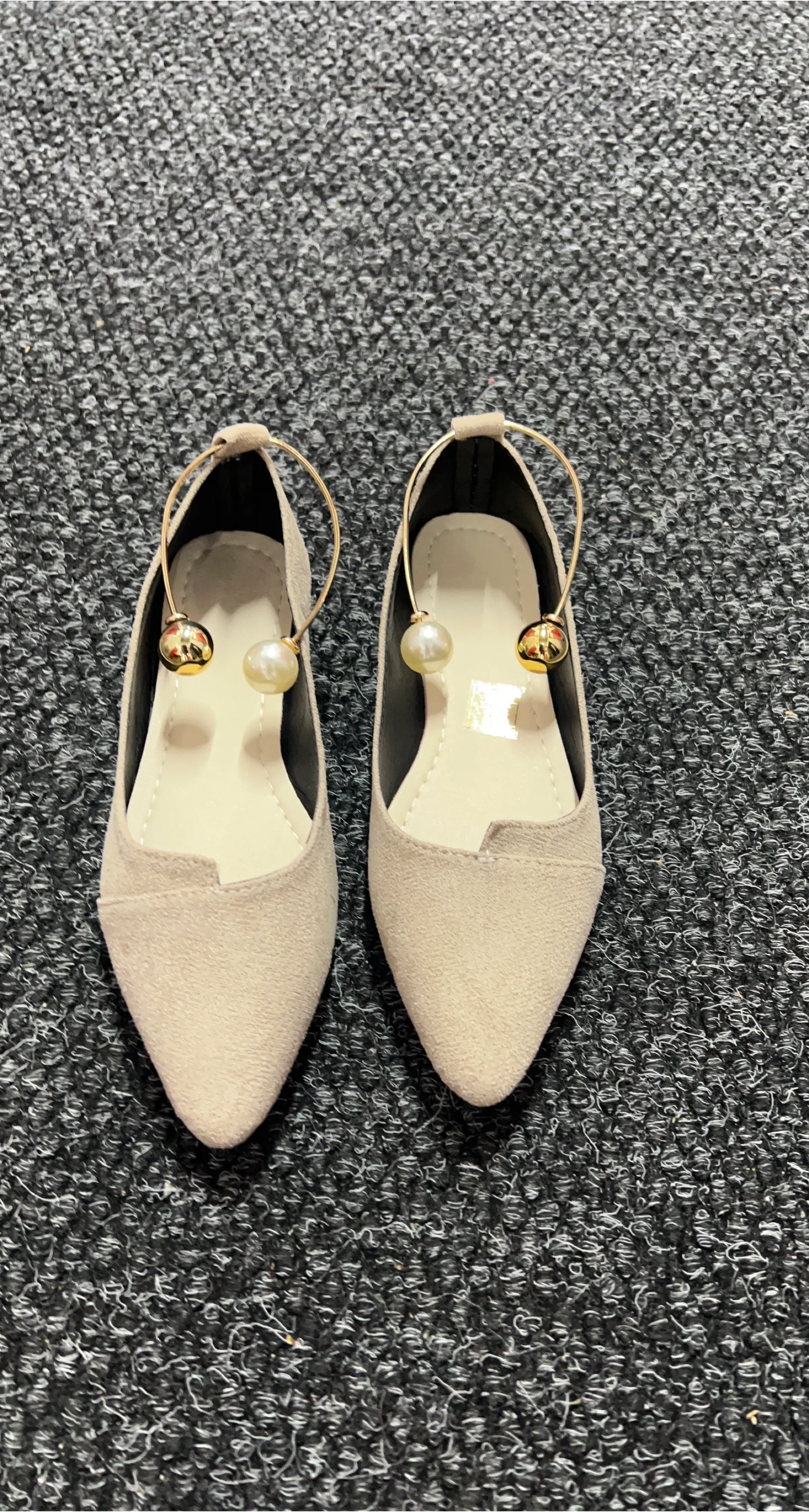 Women's Faux Suede Pointed Toe Flats with Pearl and Gold Charm