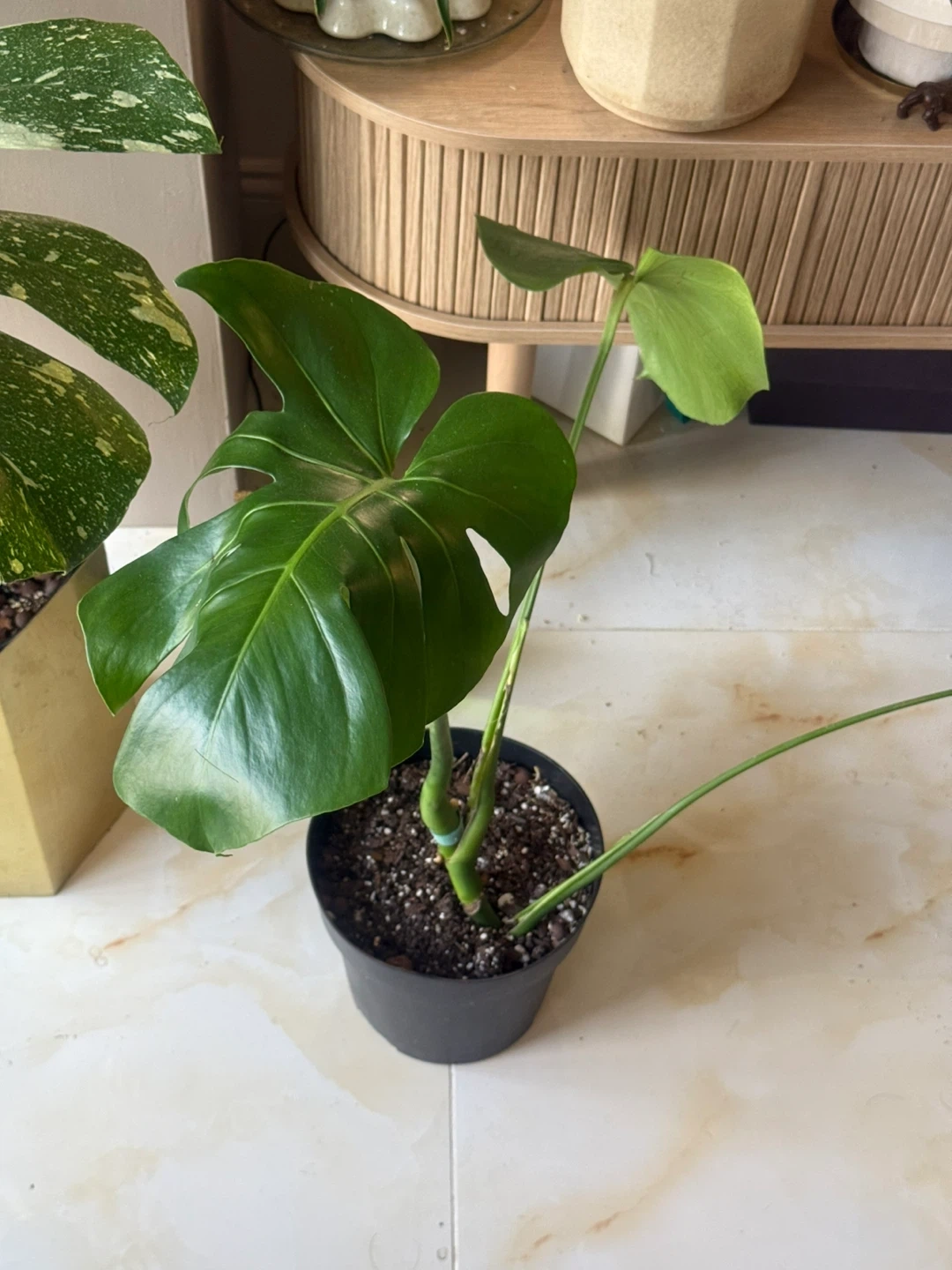 a healthy Monstera plant, potted in a simple 9” black nursery pot. It's a beautiful addition to any indoor space and relatively easy to care for. The leaves are a vibrant green, decent size. Pick up from queens Elmhurst