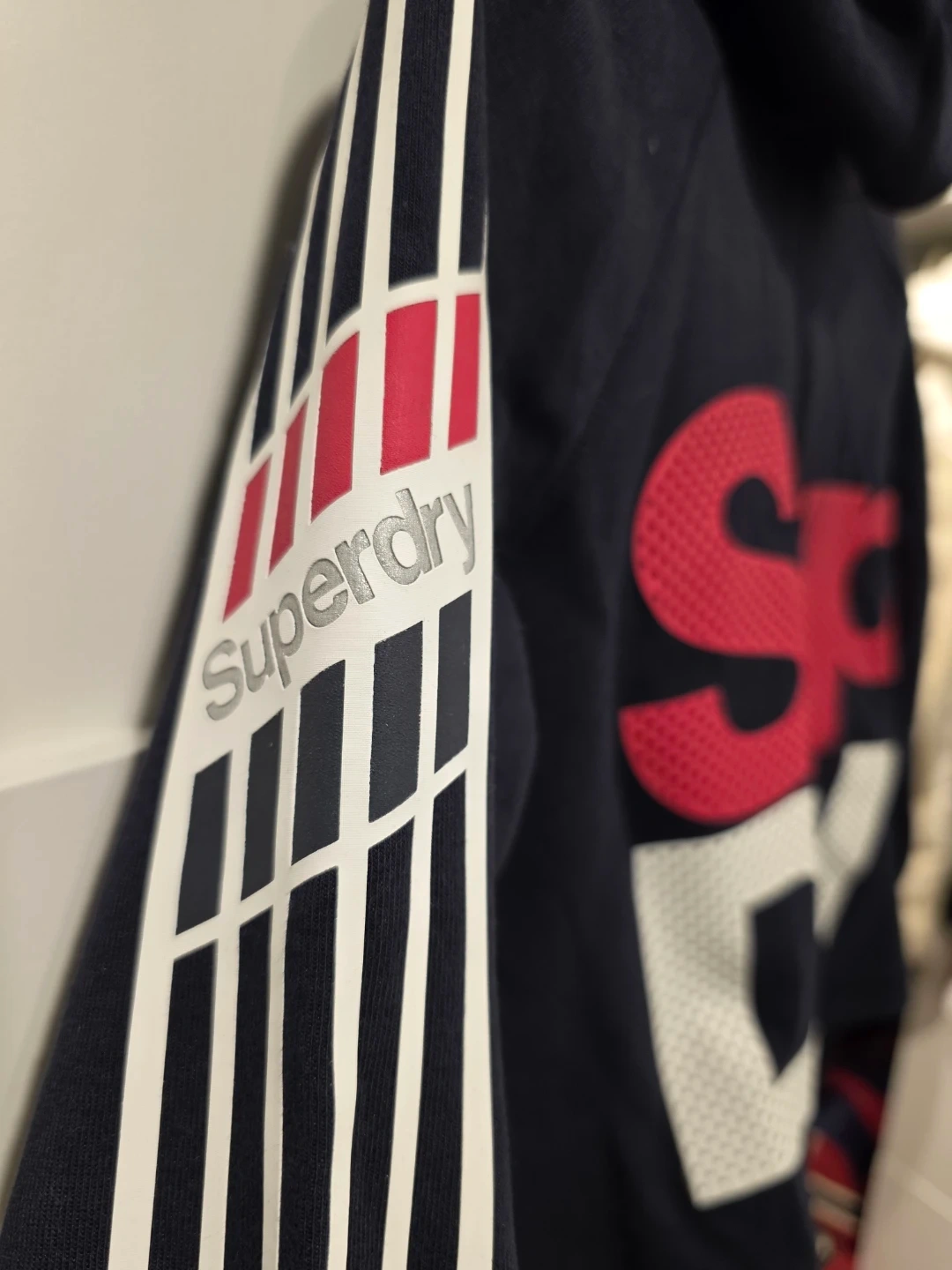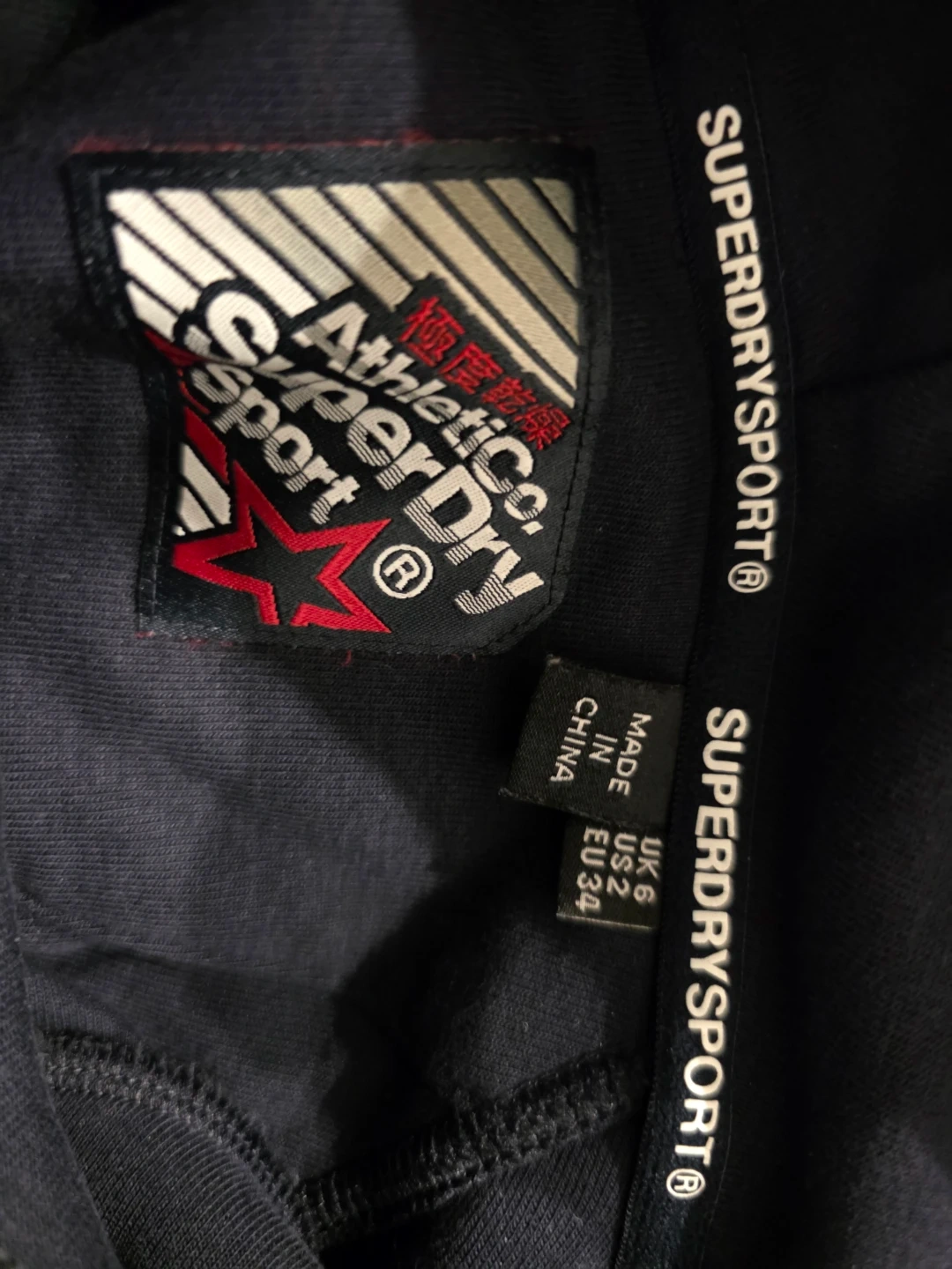 A navy Superdry Sport hoodie with signature branding on the front and back. Features stripes on the sleeves. Made in China. UK size 6, US size 2, EU size 34.