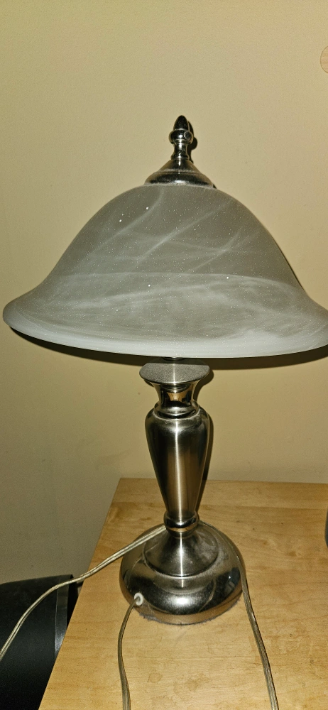 Beautiful table lamp. Features a frosted glass shade and brushed nickel base. Great for bedside table or end table. Cord and plug included.