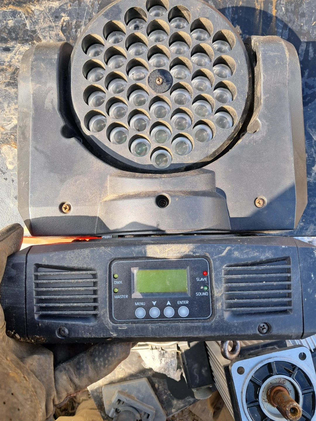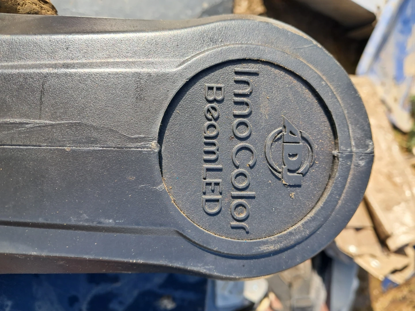 This is an American DJ INNO COLOR BEAM LED moving head light. It's powered by AC 100-240V/50/60Hz and has a power draw of 1.46A. It's made in P.R.C. This light is suitable for stage or event lighting setups.