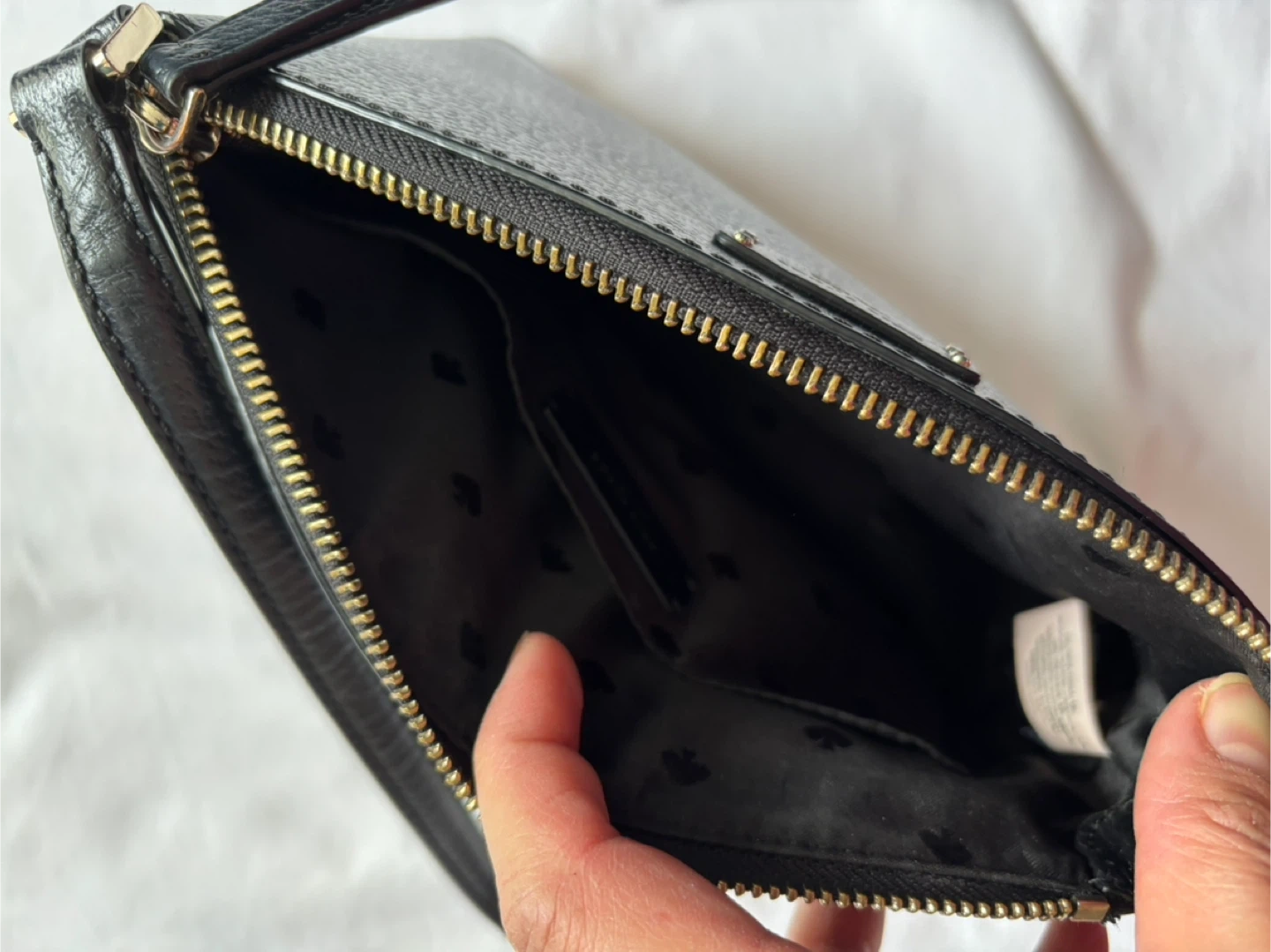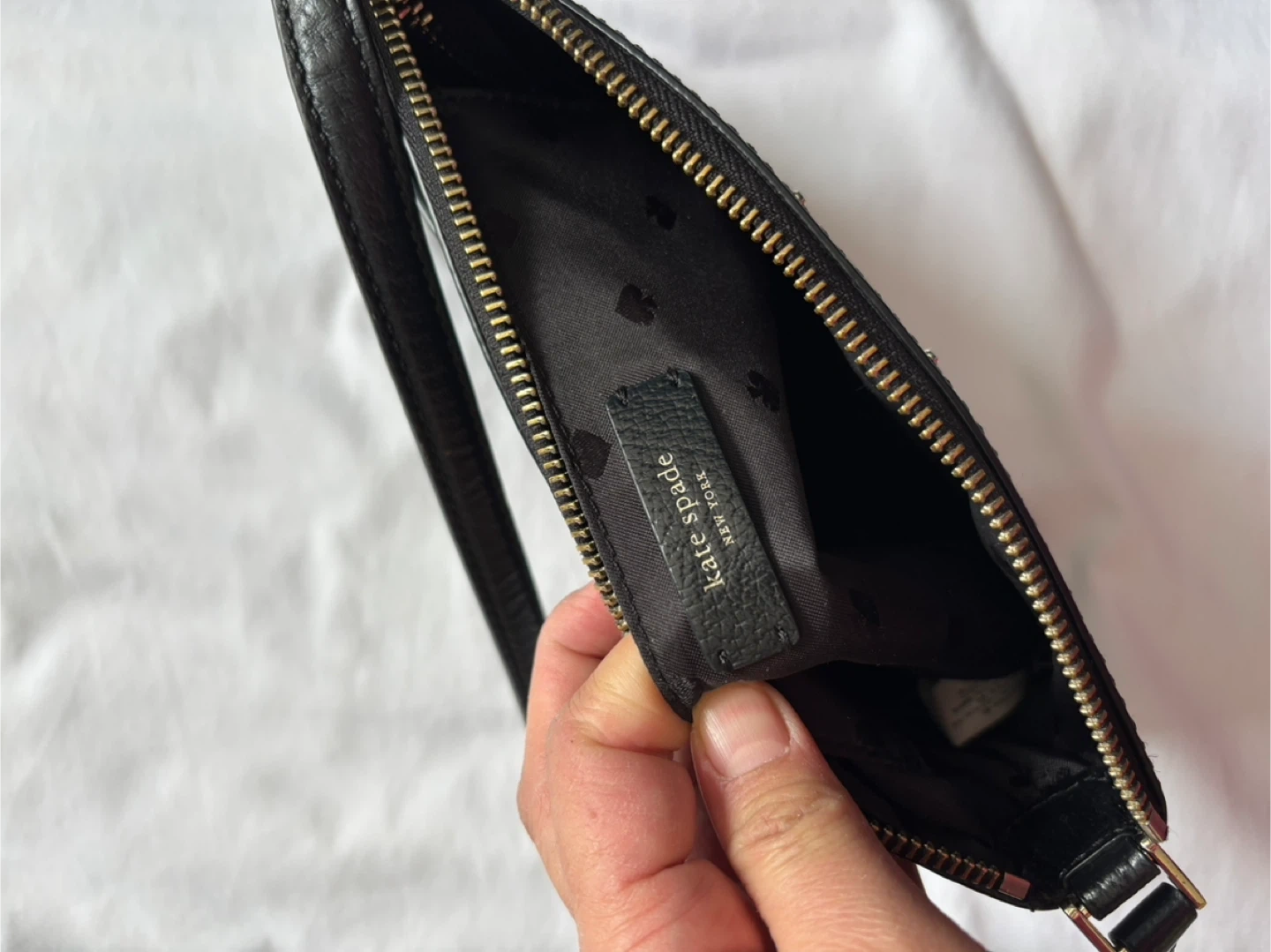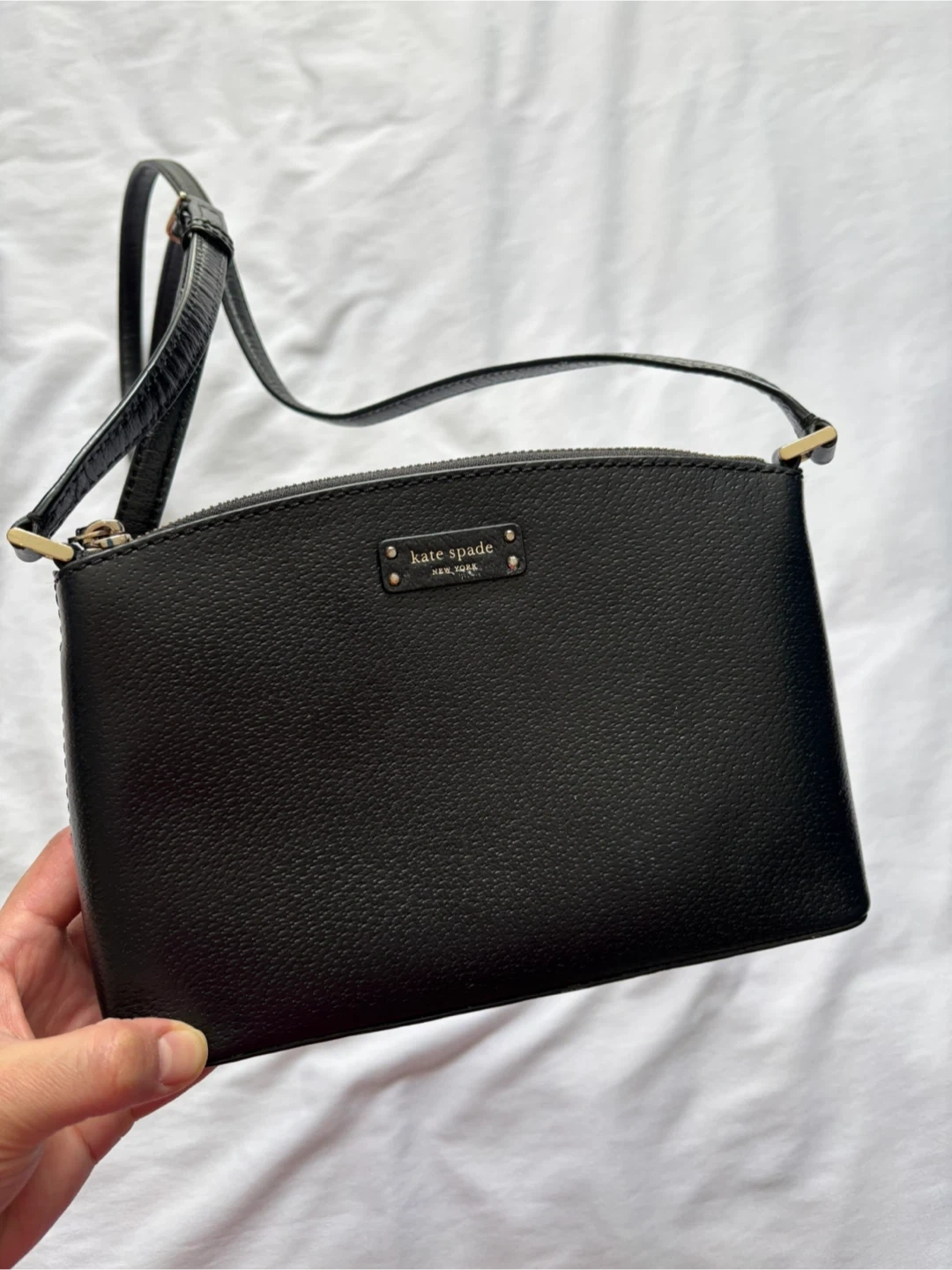 This is a black pebbled leather Kate Spade crossbody bag. It features a zippered closure and an adjustable strap. The interior is lined with signature spade print fabric.