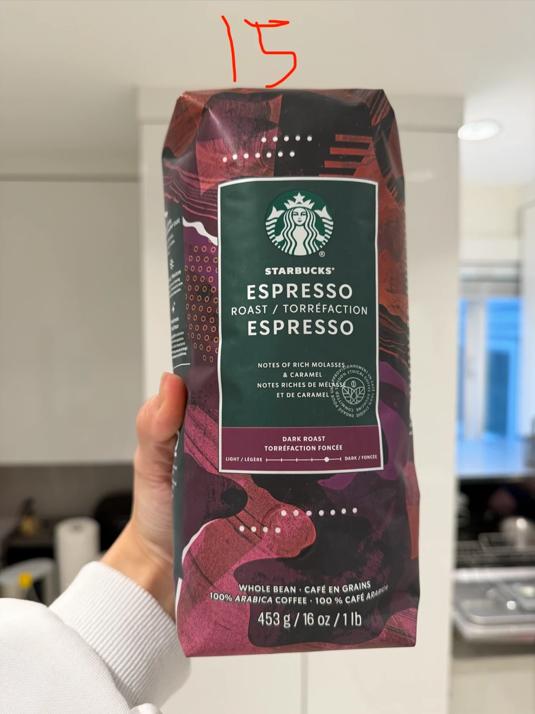 Three bags of Starbucks whole bean 100% Arabica coffee. Includes True North Blend (Blonde Roast), 1971 Roast (Dark Roast), and Espresso Roast (Dark Roast). Each bag is 453g / 16 oz / 1lb. Notes include toasted nuts, milk chocolate, sugar, and rich walnut.