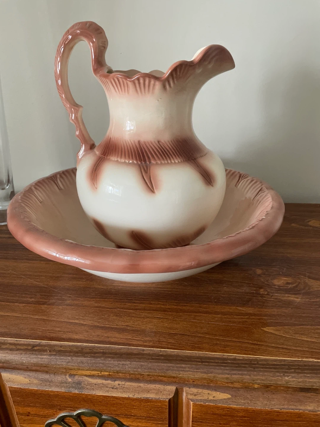 This ceramic wash basin set features a pitcher and matching bowl. It has a ruffled rim and a decorative brown floral pattern. A charming addition to any antique collection!