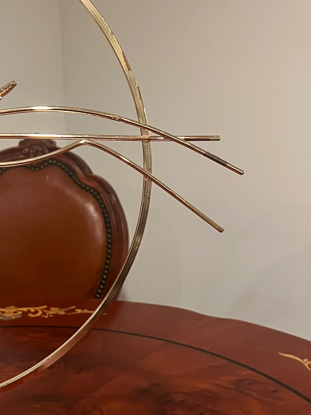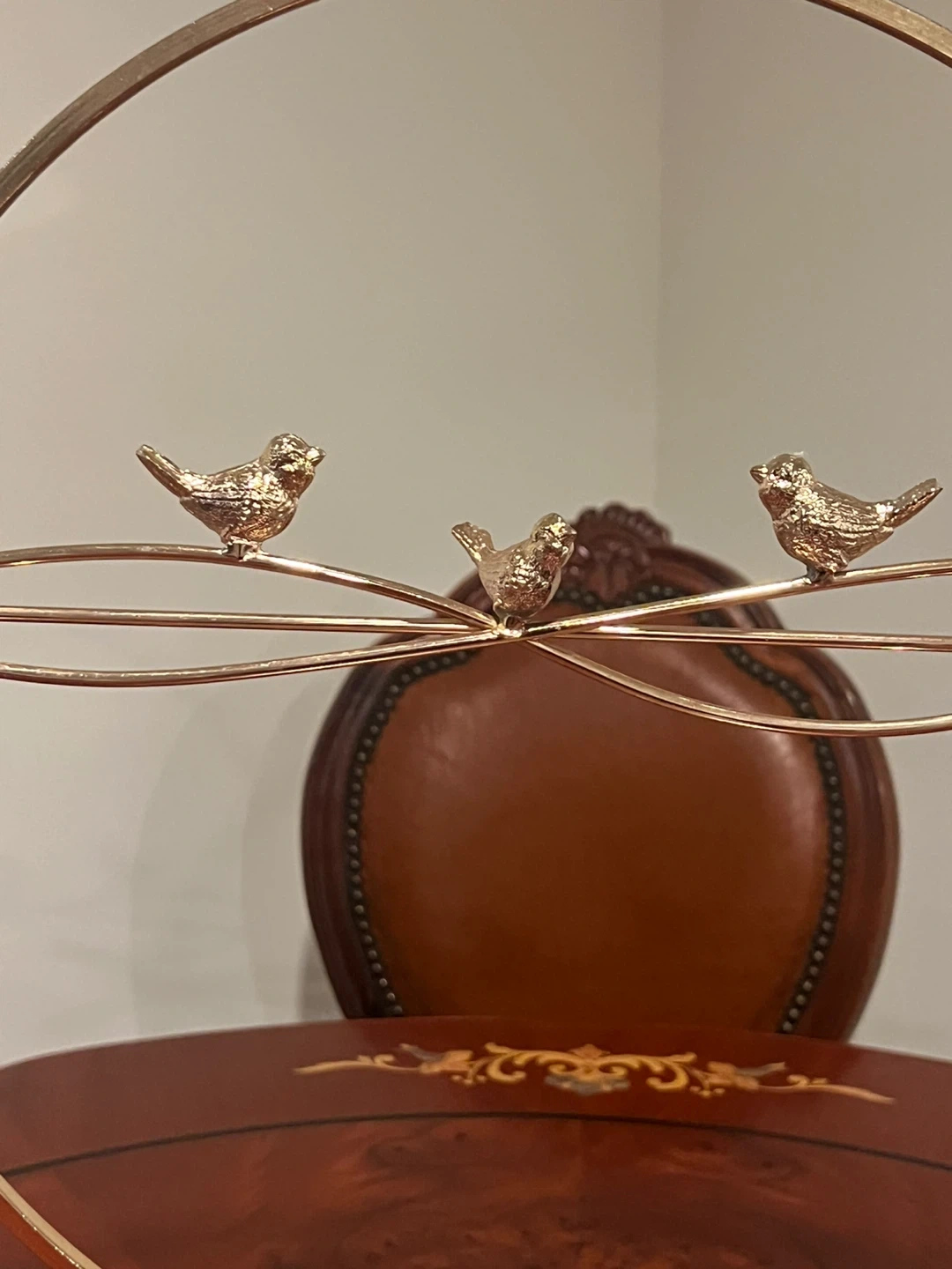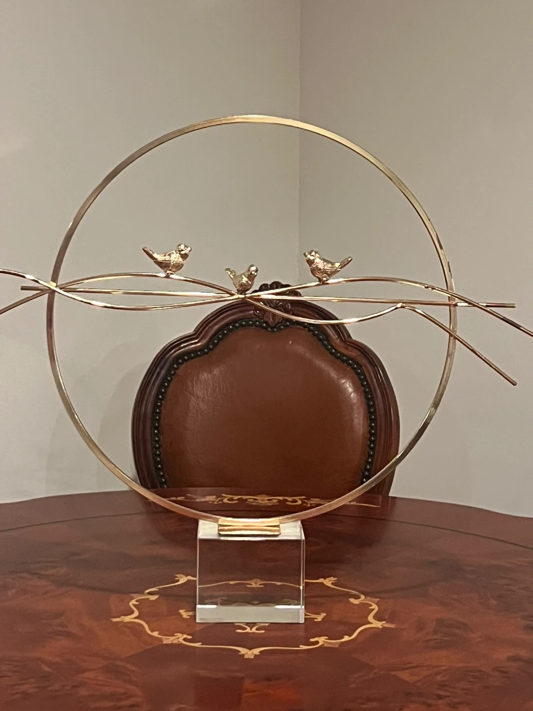 A decorative sculpture featuring three small birds perched on branches within a gold-toned circular frame. It's mounted on a clear acrylic cube base. Adds a touch of elegance to any shelf or tabletop!