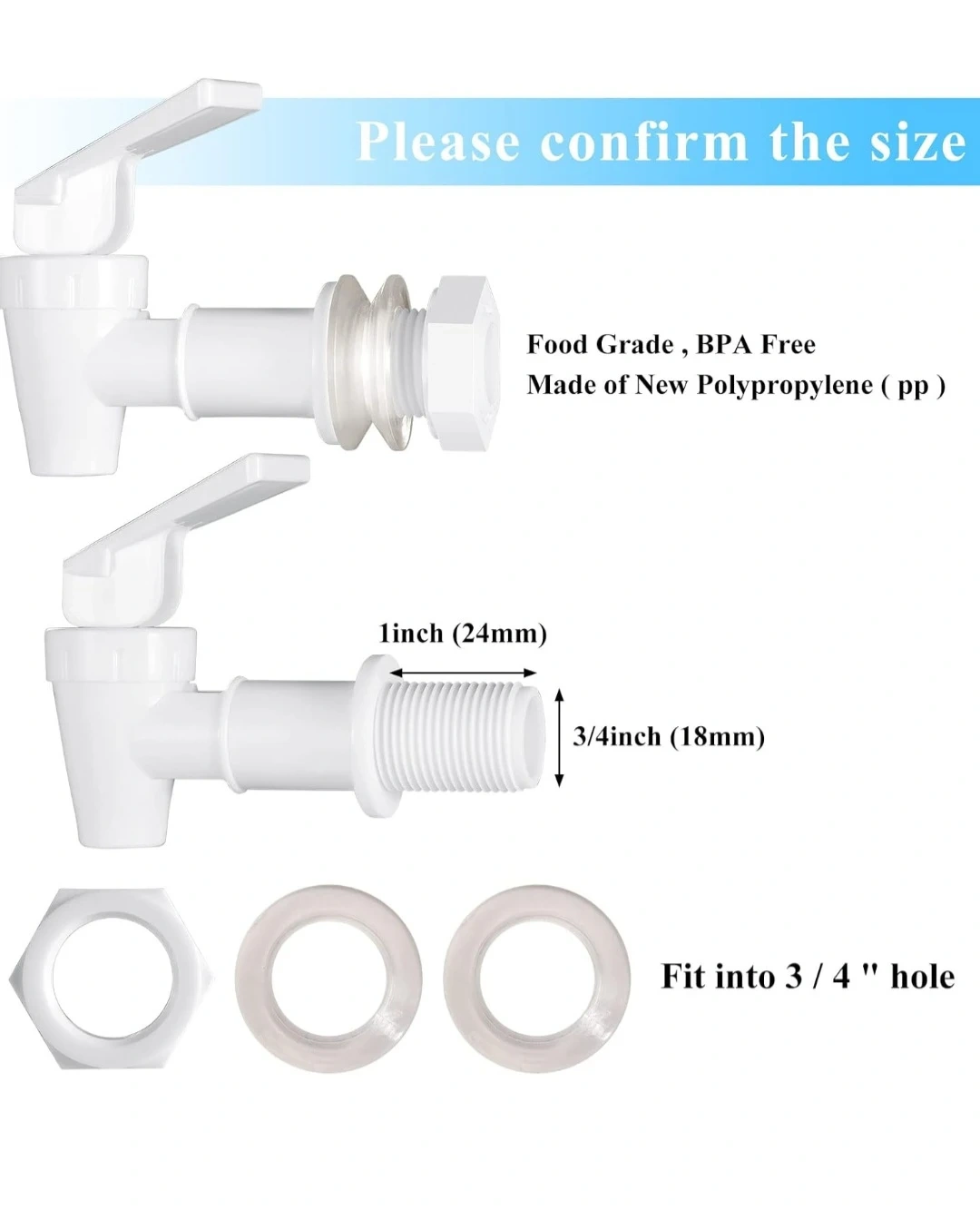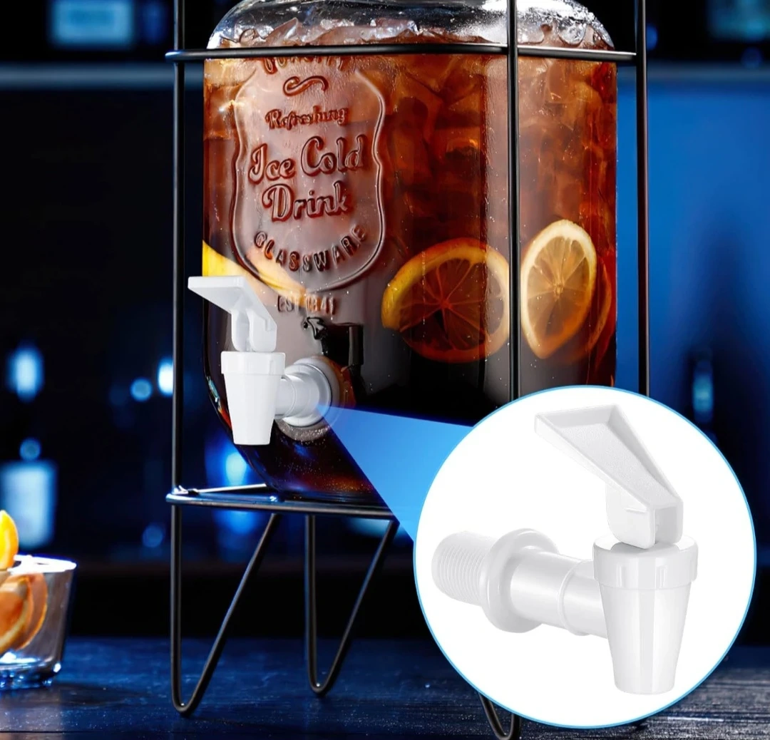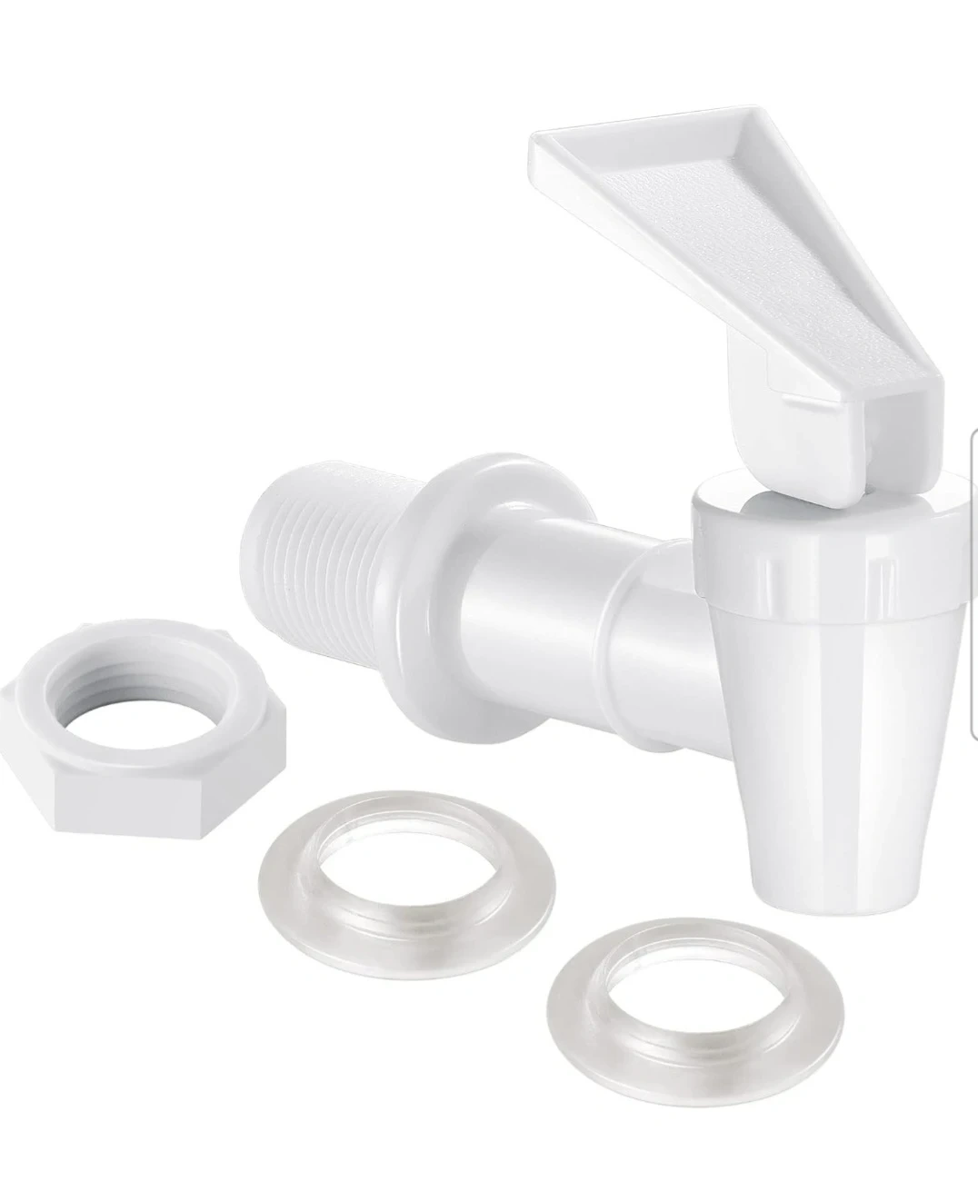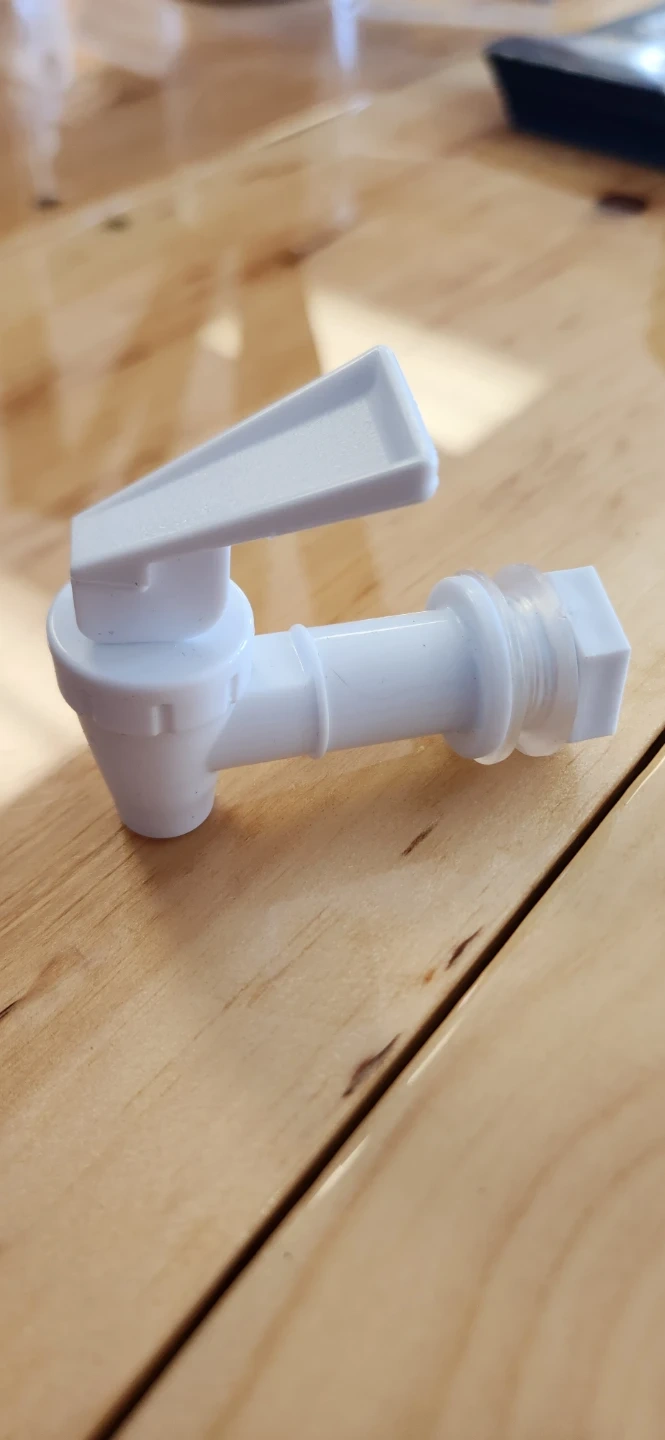 Replacement spigot for water dispensers. It's made of white plastic and features a 360-degree rotating handle. This spigot is easy to use for dispensing beverages.