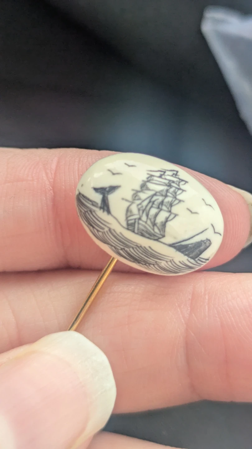 This is a vintage stick pin with an oval cabochon featuring a detailed scene of a sailing ship, whales, and birds. The artwork is black on a cream-coloured background and appears hand etched.