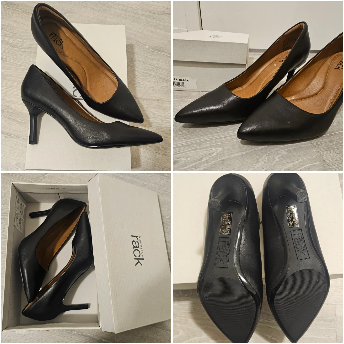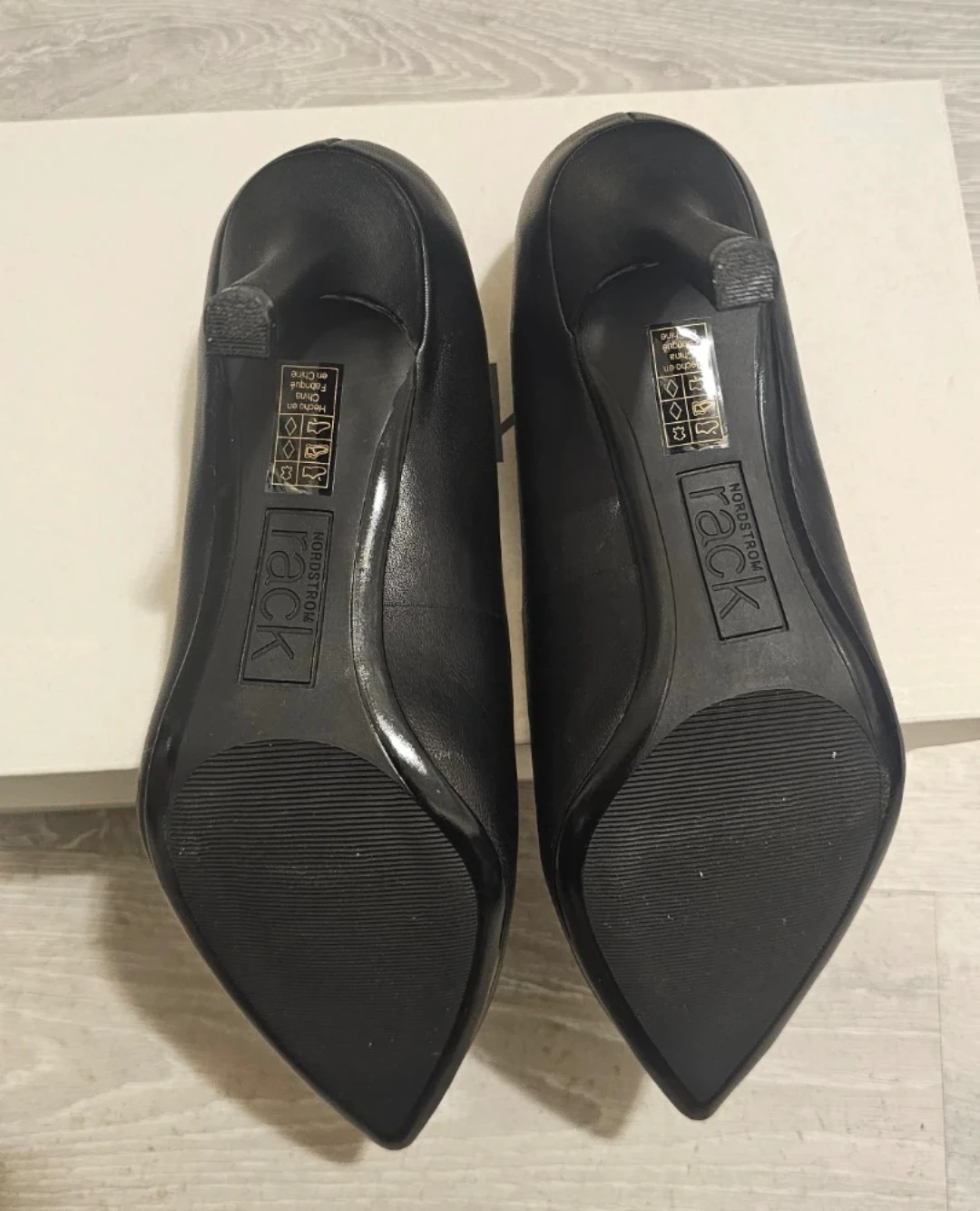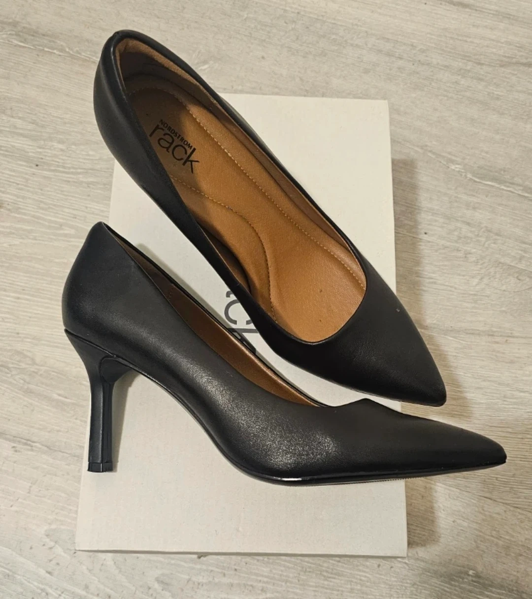These black pointed toe heels from Nordstrom Rack are made of leather. They come in size 6.5 and include the original box.