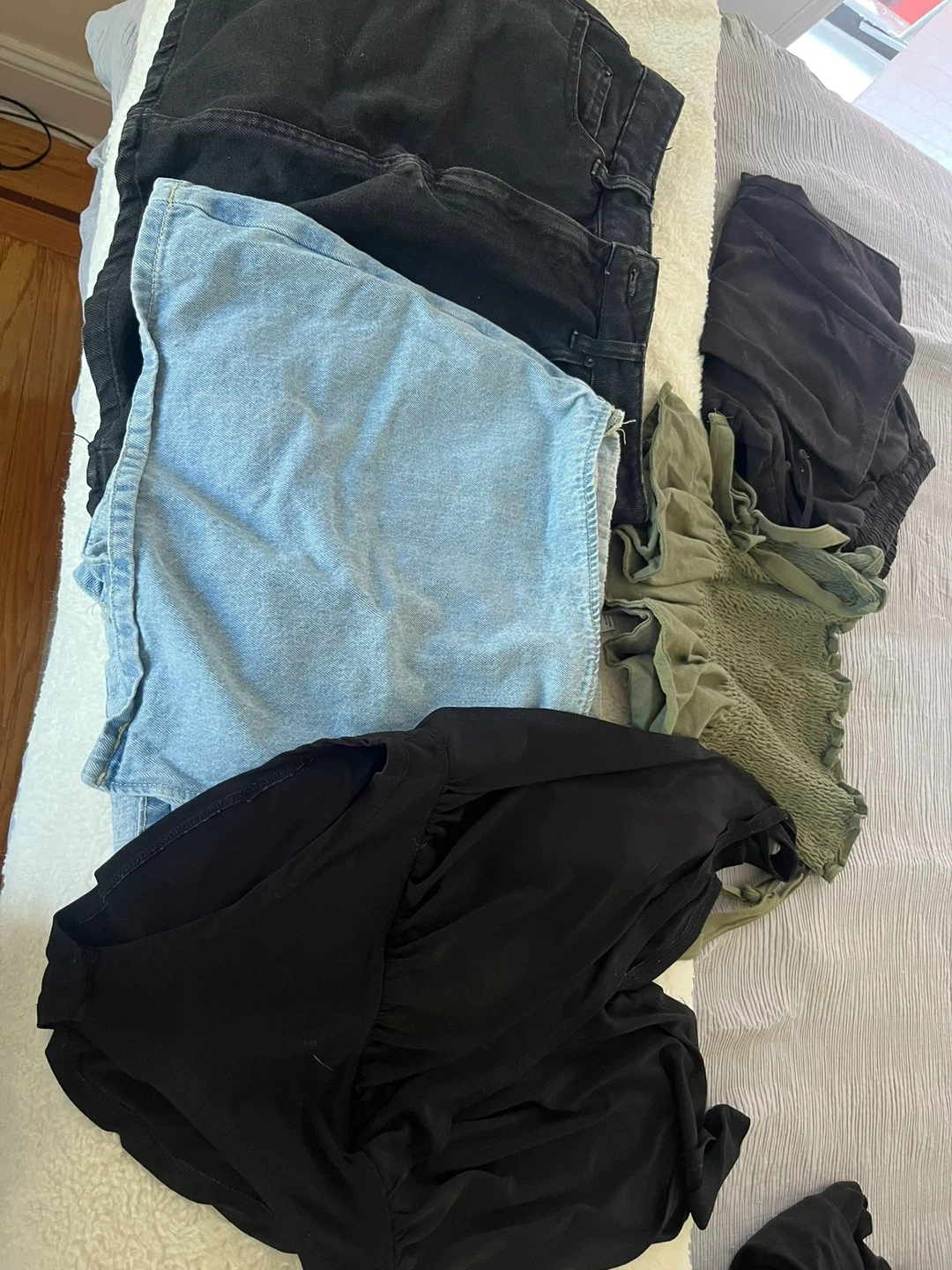 Selling a bundle of assorted clothing items! Included is a Loft dress with a maroon and black geometric pattern, a black dress with a twist front detail, a pair of jean shorts, a green floral dress, and a few pairs of leggings in various colors and patterns