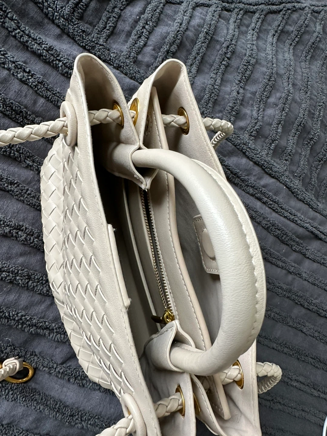 A chic white woven leather handbag with braided straps and gold hardware. It features a zippered interior pocket and a detachable crossbody strap. This bag is perfect for everyday use or for a night out!