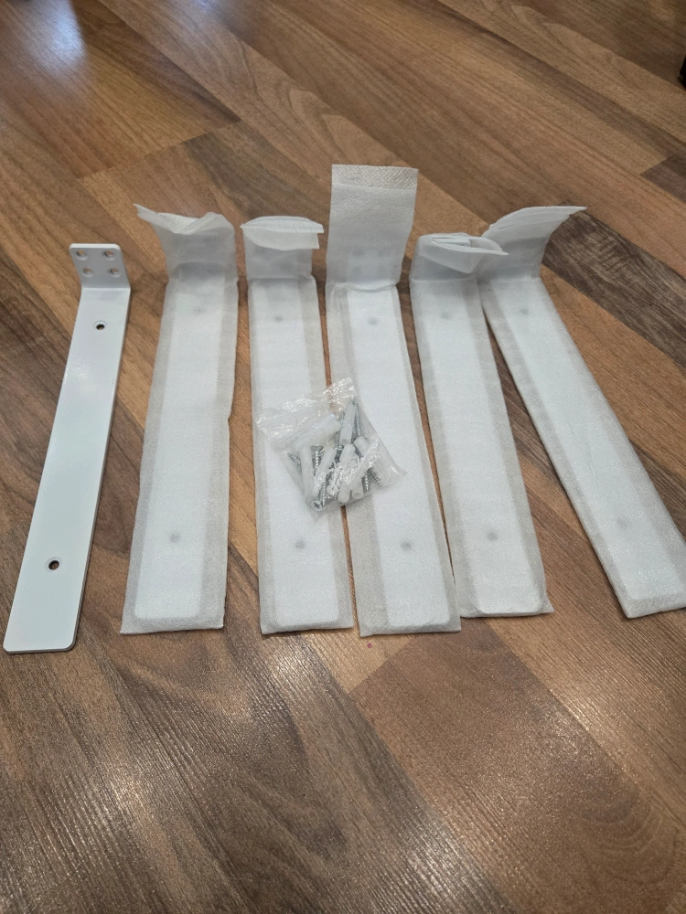 Selling a set of 6 brand new white shelf brackets! They look to be in perfect condition and come with screws and wall anchors. Great for adding some extra storage space to any room