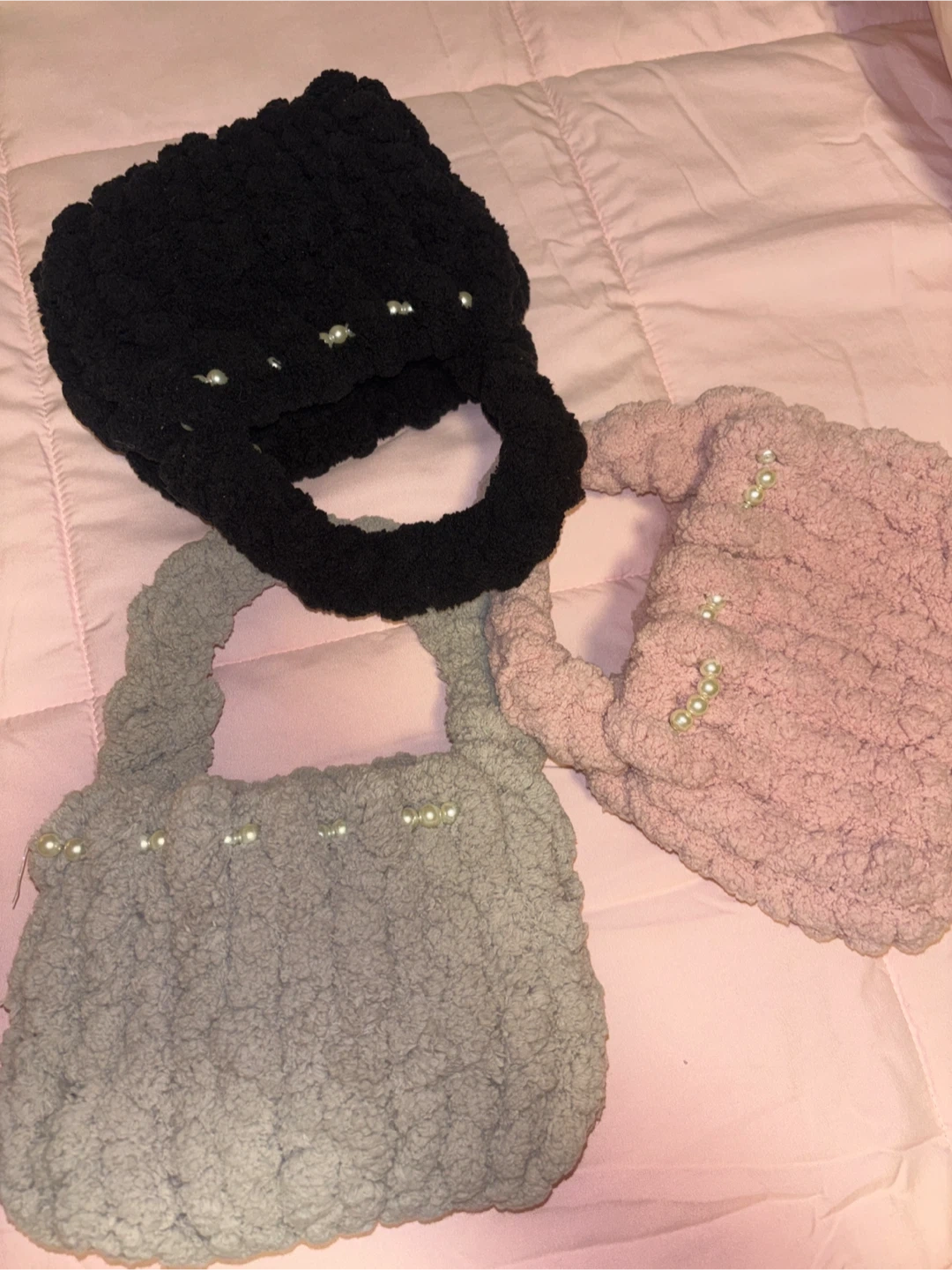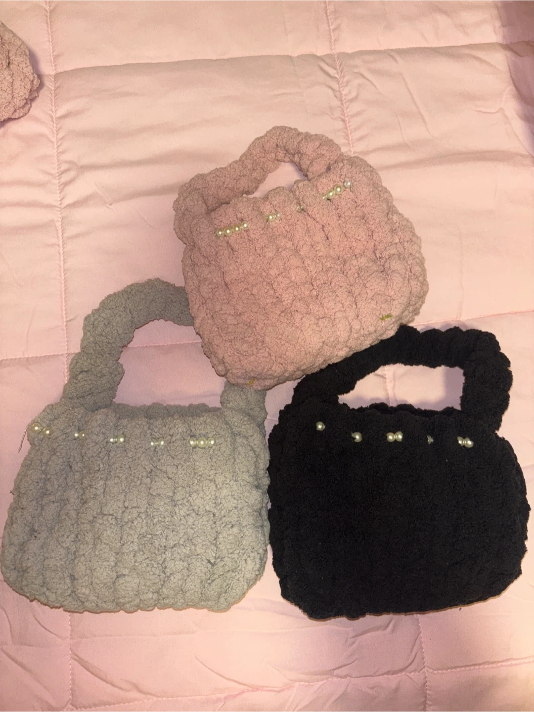 Handmade cute crocheted mini handbags. They're decorated with faux pearls along the top closure. The yarn is super soft and chunky. Perfect for holding small essentials.