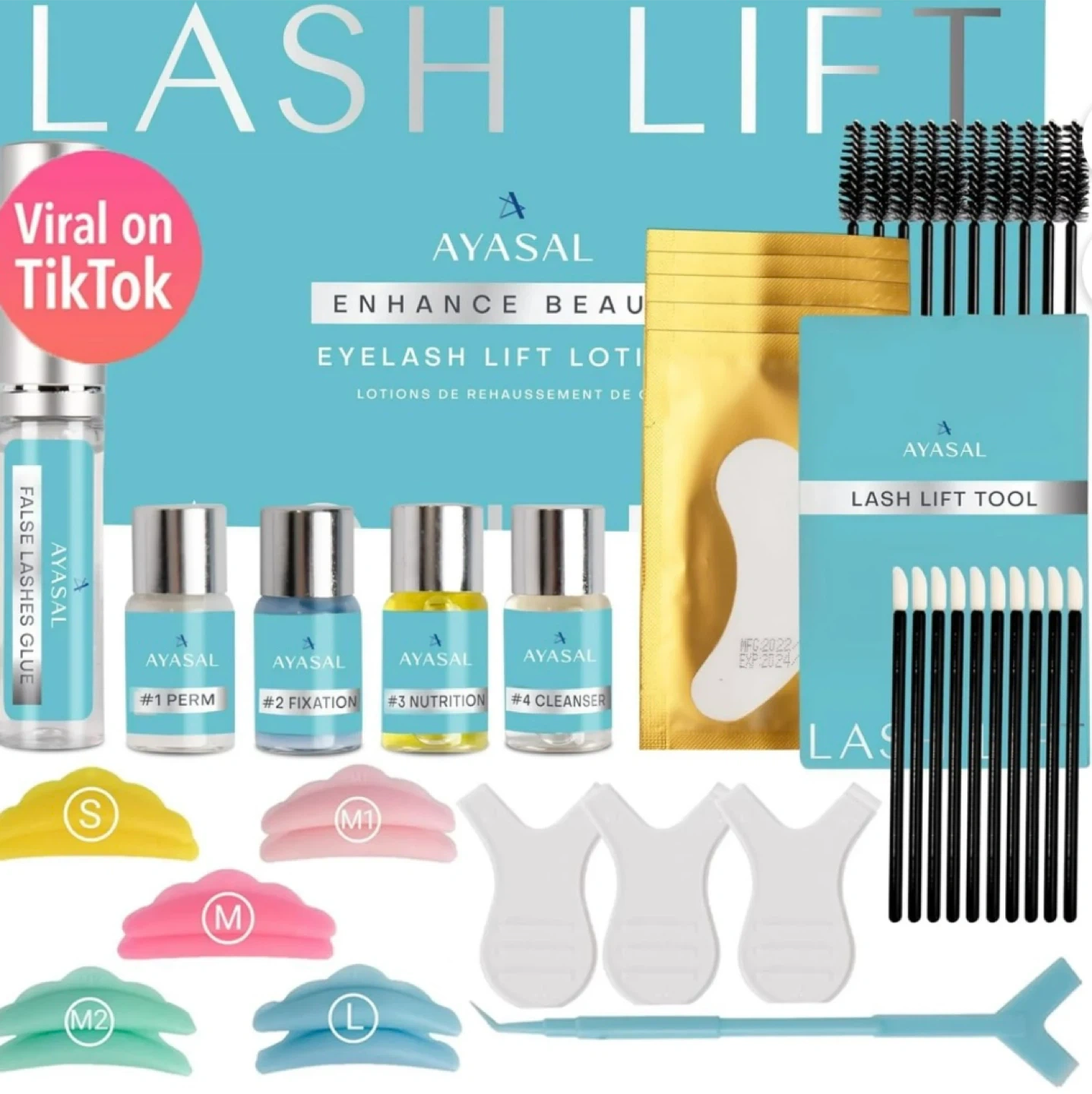 This AYASAL Eyelash Lift Kit is designed for beginners or pros to achieve beautiful curls. It provides long-lasting results for over 4 weeks. The kit includes perm lotion, fixation lotion, nutrition lotion, cleanser, lash lift tools, and various sizes of under eye pads and lash lift shields.