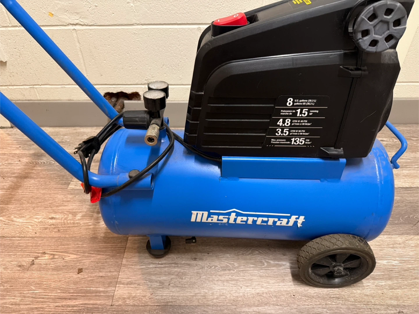 Mastercraft 8 U.S. gallon air compressor. It's got a 1.5 running HP motor and a max pressure of 135 PSI. CFM is 4.8 at 40 PSI and 3.5 at 90 PSI. This compressor is ready for various shop tasks!