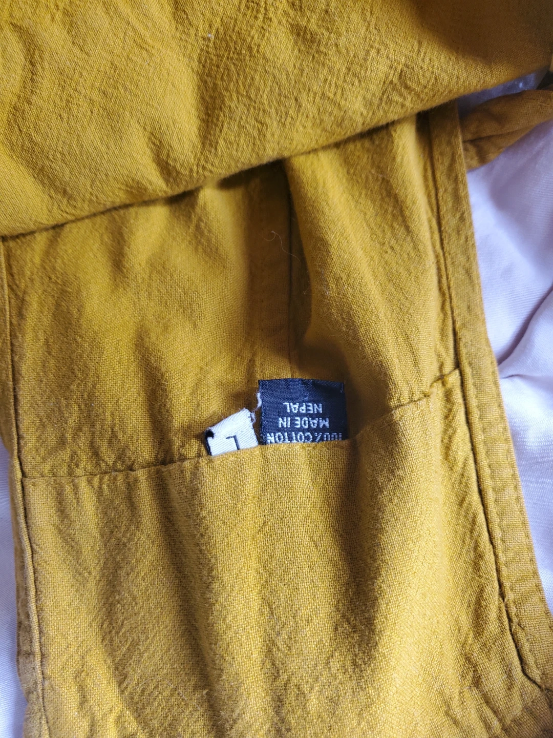 These yellow overalls are made of 100% cotton and are a size large. They were made in Nepal. The overalls have a bib pocket with a button closure.