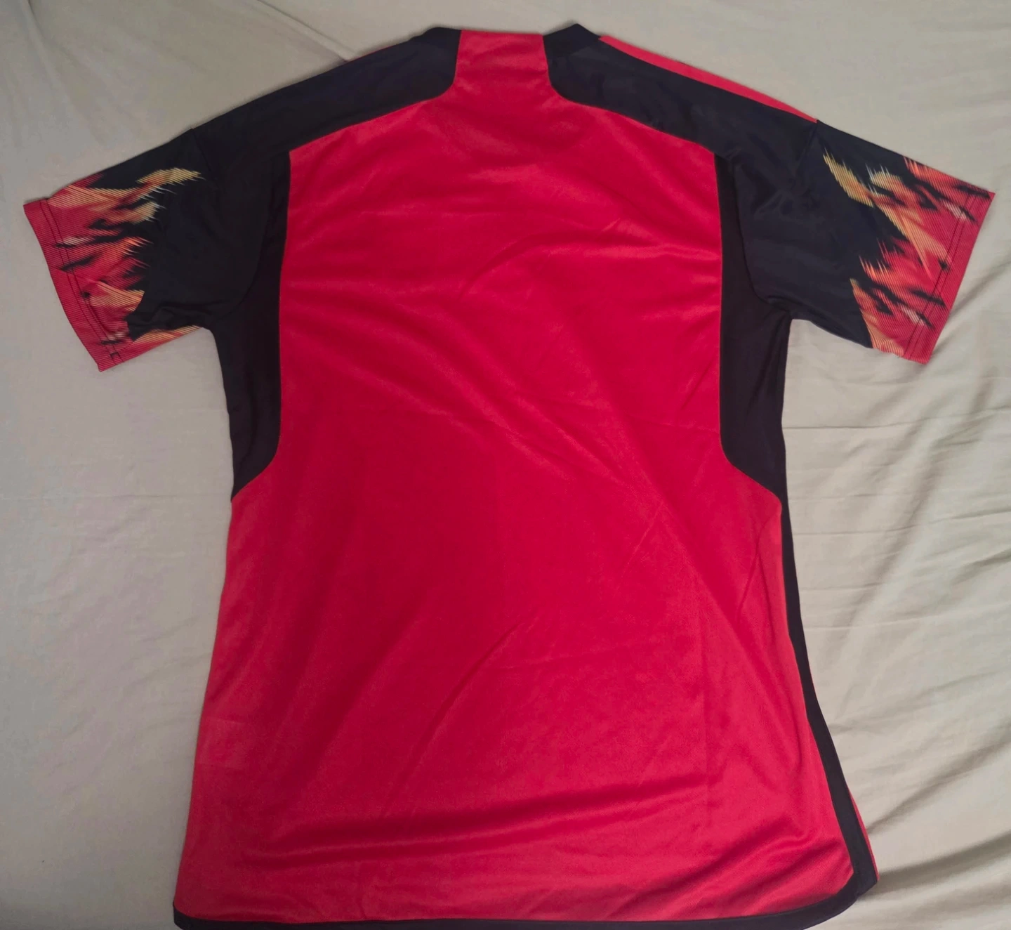 Selling an Adidas Belgium soccer jersey in size L. The jersey is red with black accents and features the Belgium national team crest. It's in great condition!