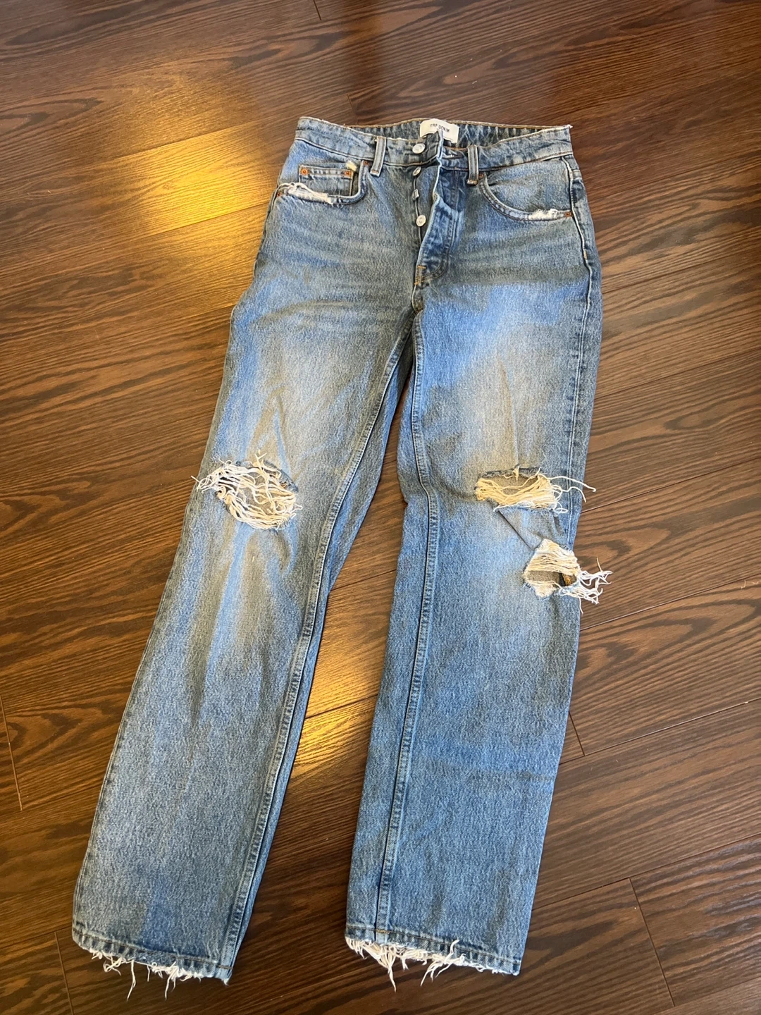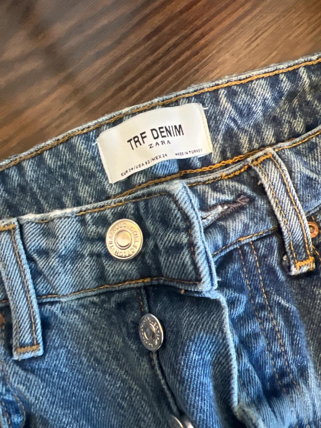 These ZARA TRF denim jeans feature a distressed, ripped style. The jeans are a light wash blue. They're made in Turkey. Size is EU 36/US 2/MEX 24.