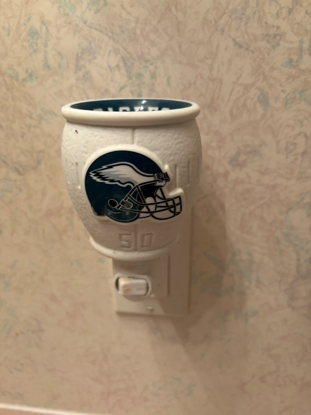Philadelphia Eagles scentsy warmer featuring the team's helmet logo and the number 50. It has an on/off switch for easy use. Perfect for any Eagles fan's room!
