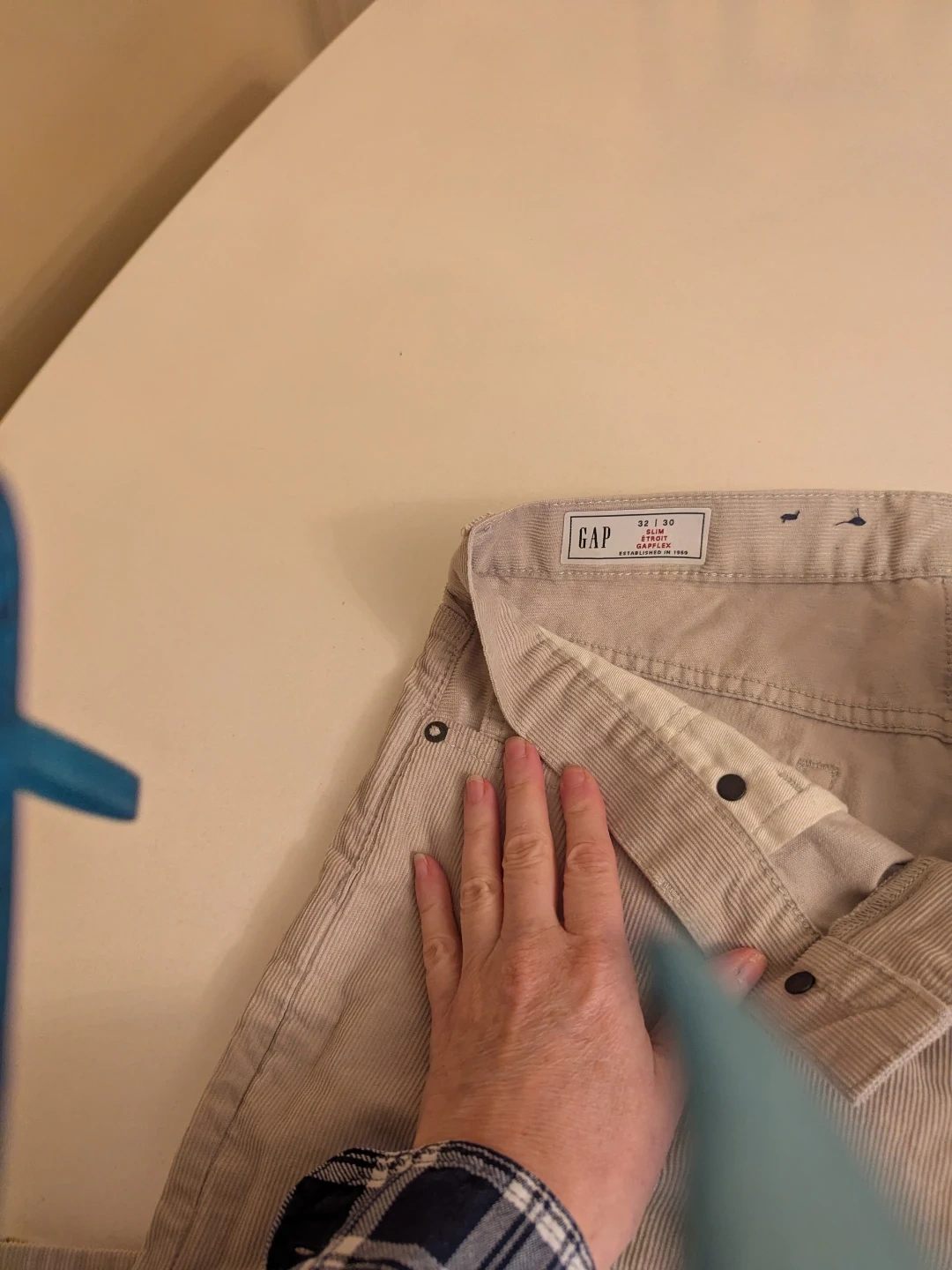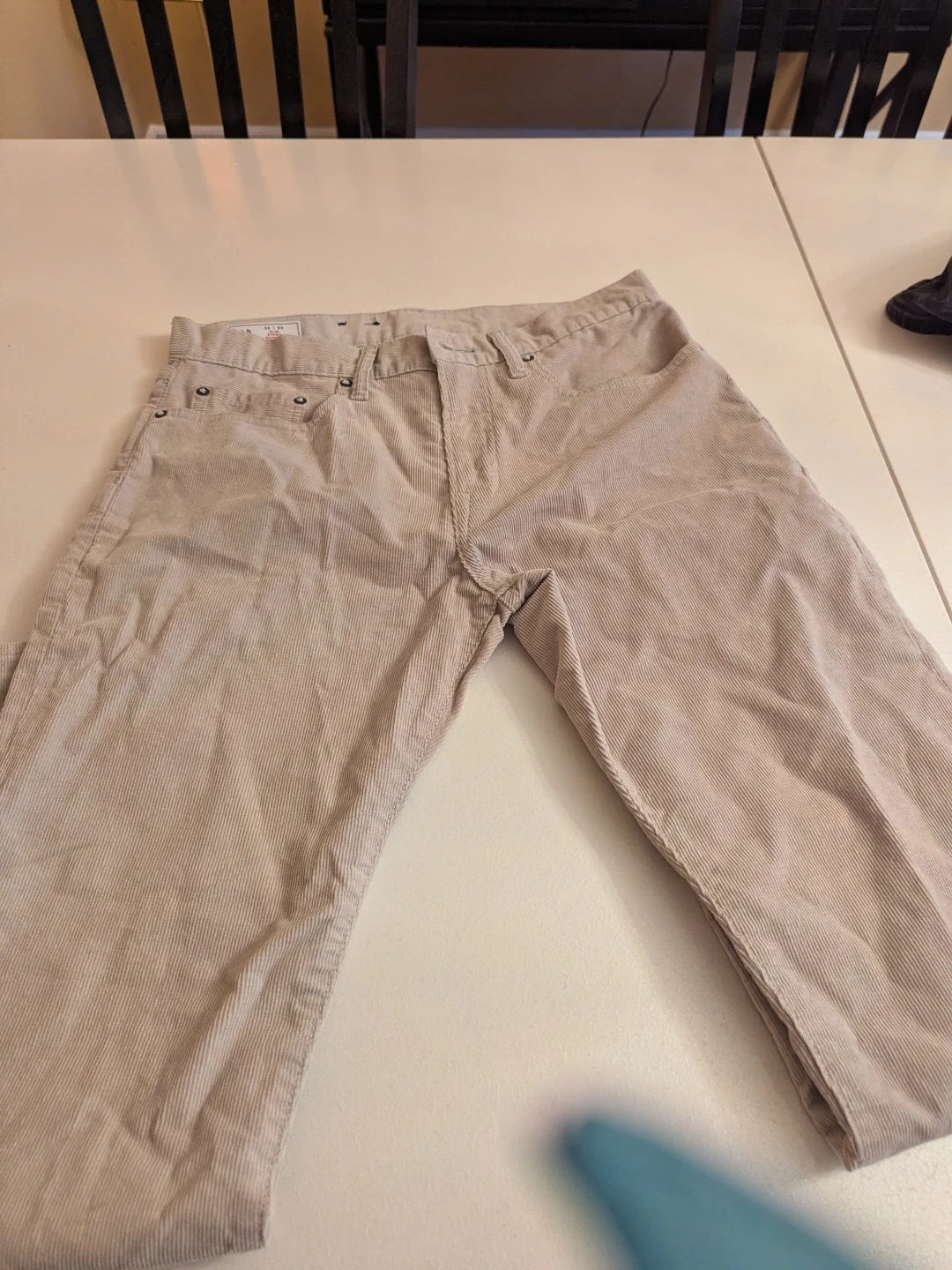 These are GAP beige corduroy pants. They're slim size 32 waist by 30 inseam. The material is corduroy. Perfect for casual wear!