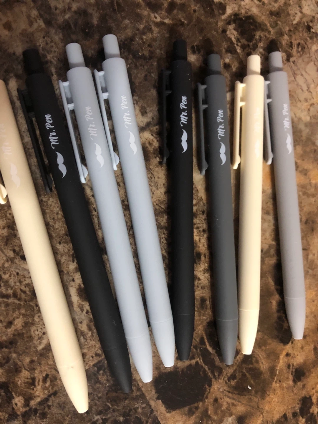 Selling a new set of 8 Mr. Pen pens in various matte colours: beige, black, dark grey, and light grey. These pens feature a smooth writing experience and a comfortable grip. They're great for everyday note-taking or journaling!