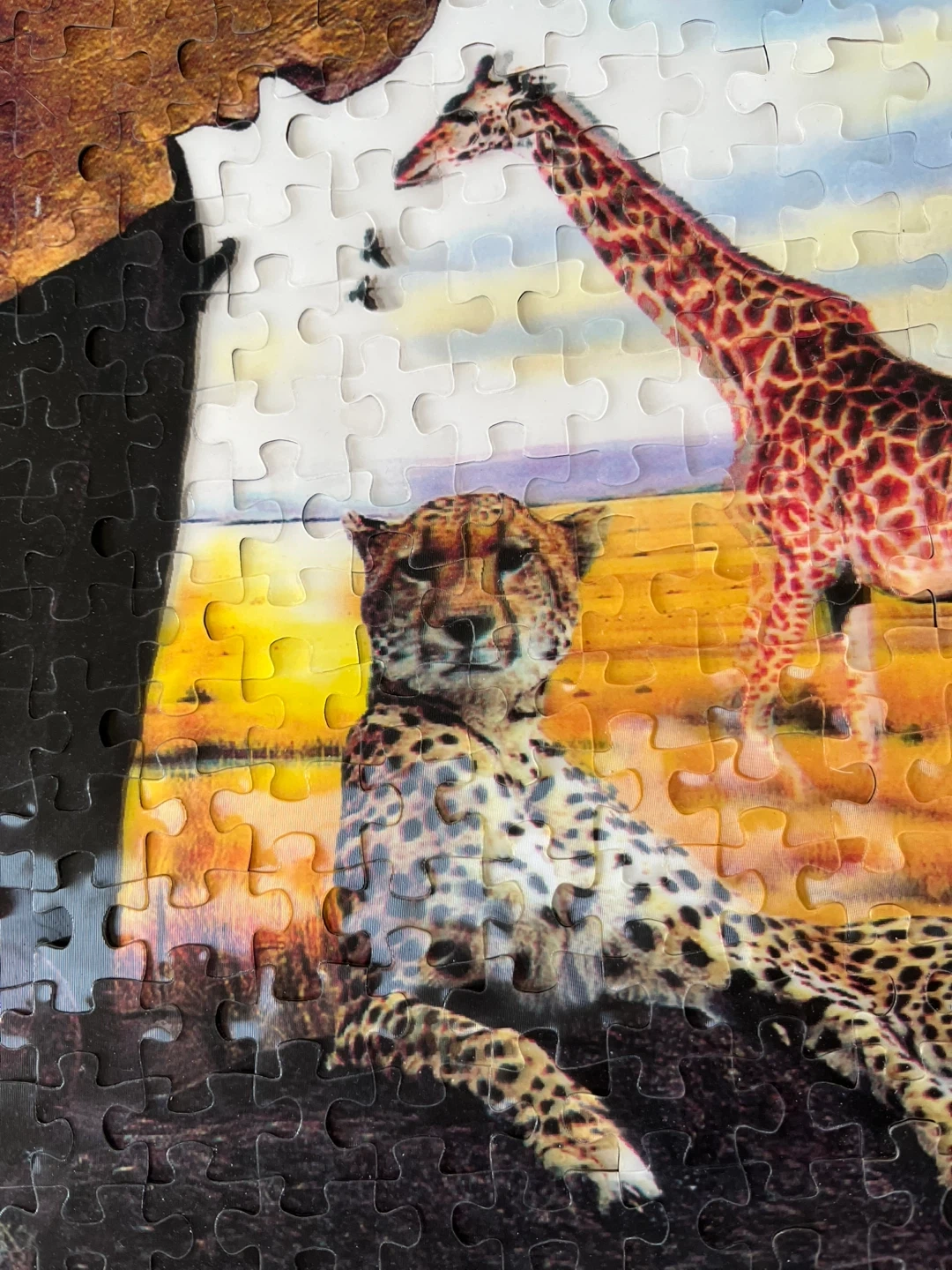 A 3D jigsaw puzzle featuring African wildlife, including an elephant, giraffe, cheetah, and eagle. Great for animal lovers and puzzle enthusiasts. Assembled puzzle shows a vibrant savanna scene.