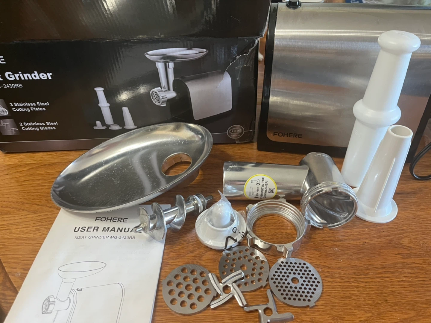 This FOHERE meat grinder is a MG-2430RB model. It comes with 3 stainless steel cutting plates and 2 stainless steel cutting blades. Some parts are not dishwasher safe.