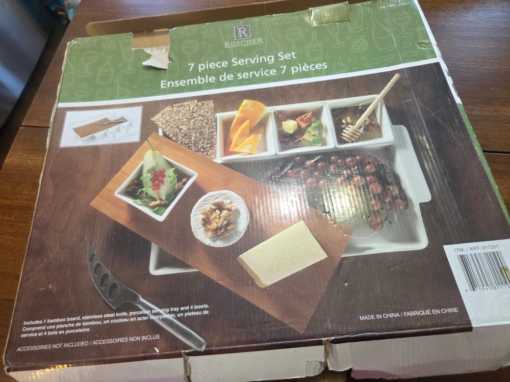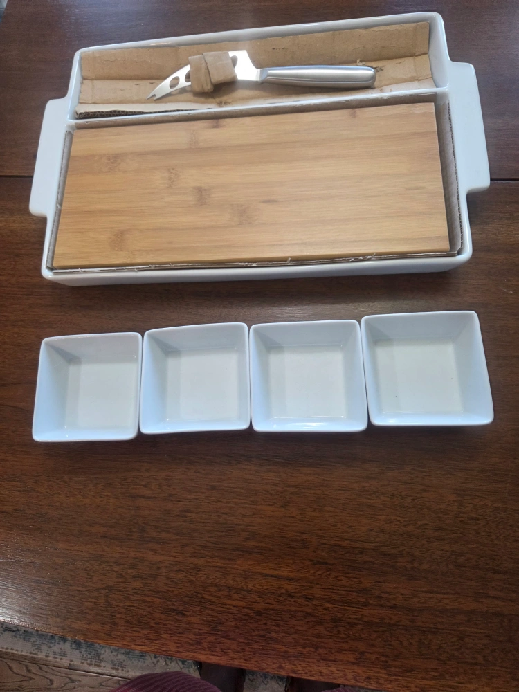 Selling a brand new Röscher 7 piece serving set. It includes a bamboo board, stainless steel knife, porcelain serving tray, and 4 bowls. The set comes in its original box! Perfect for entertaining or everyday use