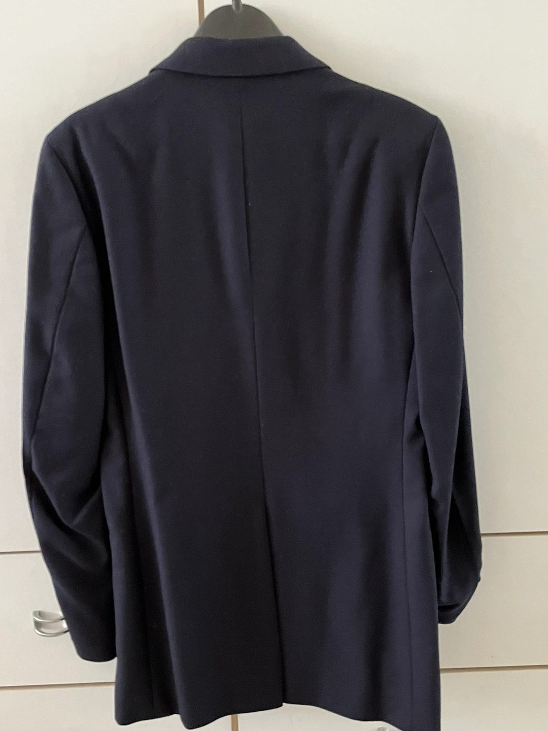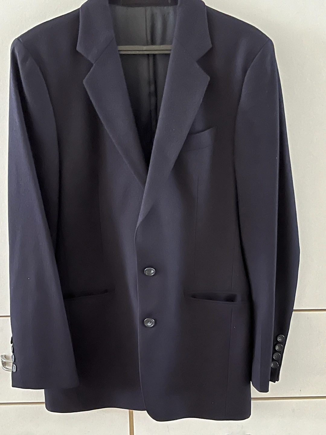 It has 2 buttons on the front and 4 buttons on the cuff. It has 3 pockets on the inside. The lining is black.