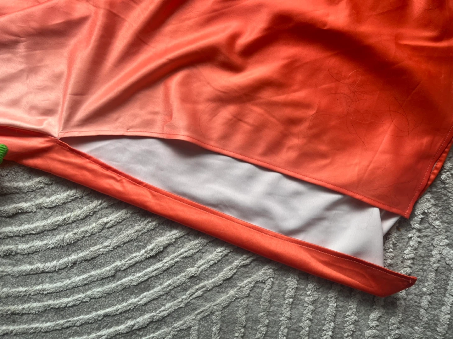 This ombre slip dress features a cowl neckline and adjustable spaghetti straps. It's made of a satiny material with a gradient of white to coral. A simple zipper closure is on the side.