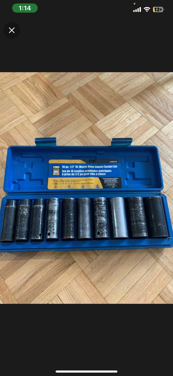10-piece 1/2-inch drive metric deep impact socket set. Sockets in sizes 11, 12, 13, 14, 15, 17, 19, 21, 22 and 24 mm. Comes in a blue plastic case.