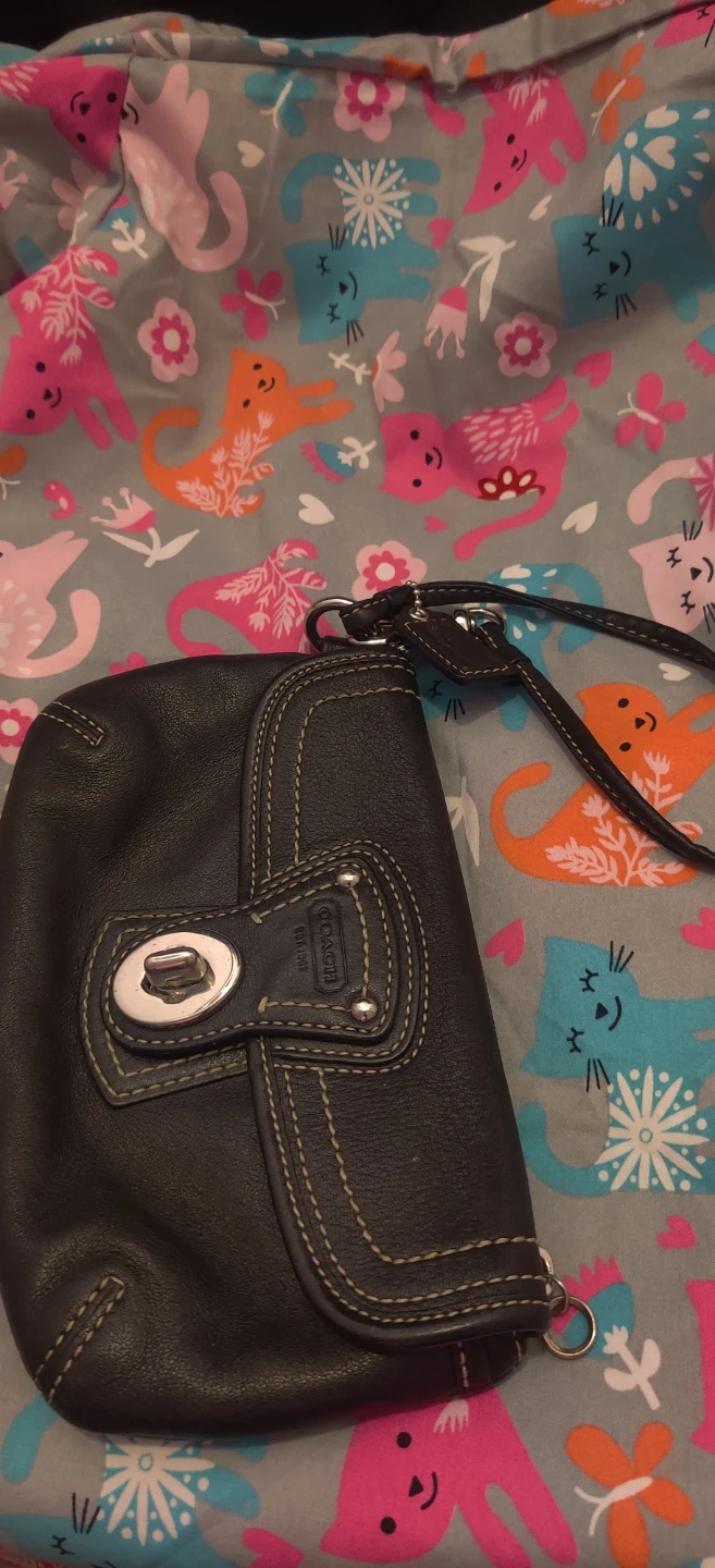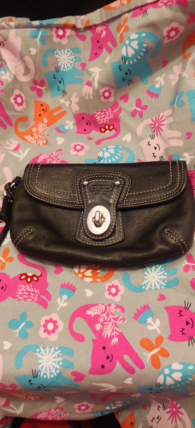 This is a black leather Coach wristlet. It has a turn-lock closure and is in good condition. Will not fot your phone. Price is firm