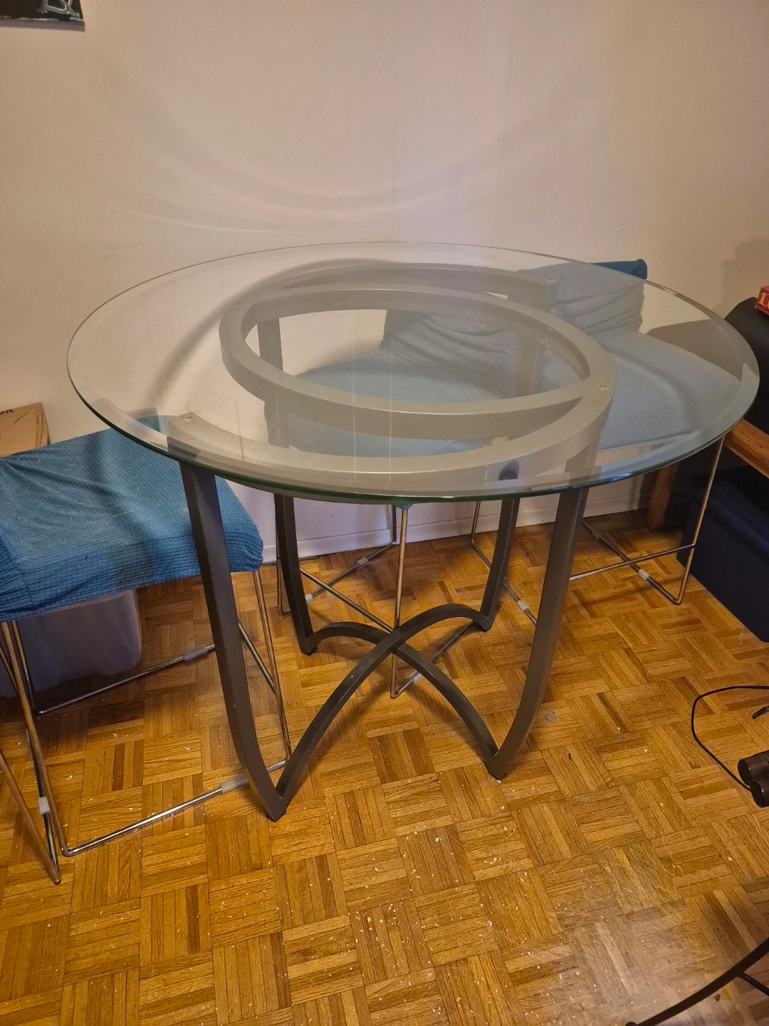 This is a round dining table with a glass top and a metal base. It's sturdy and has a unique curved leg design. The table is suitable for small spaces.
