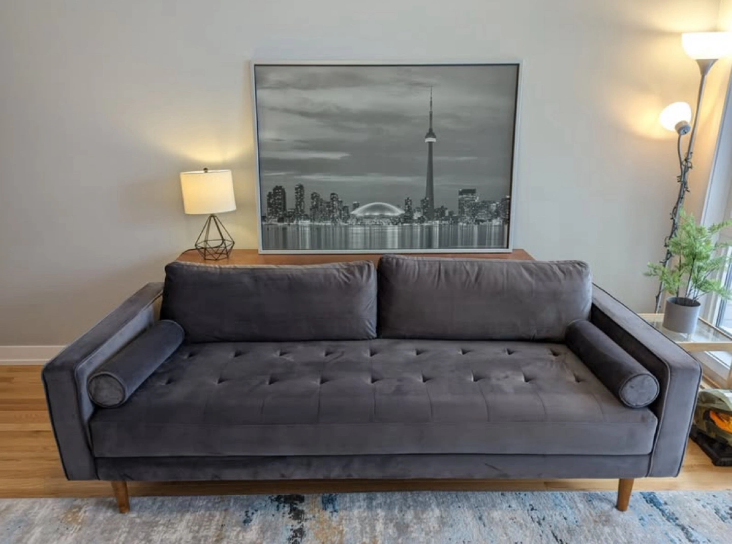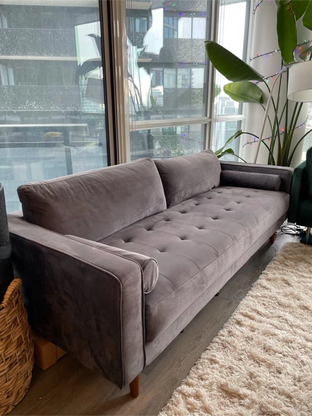Gorgeous grey velvet sofa. Mid-century modern design. Features button tufting and wooden legs. Two bolster pillows included. Excellent condition.