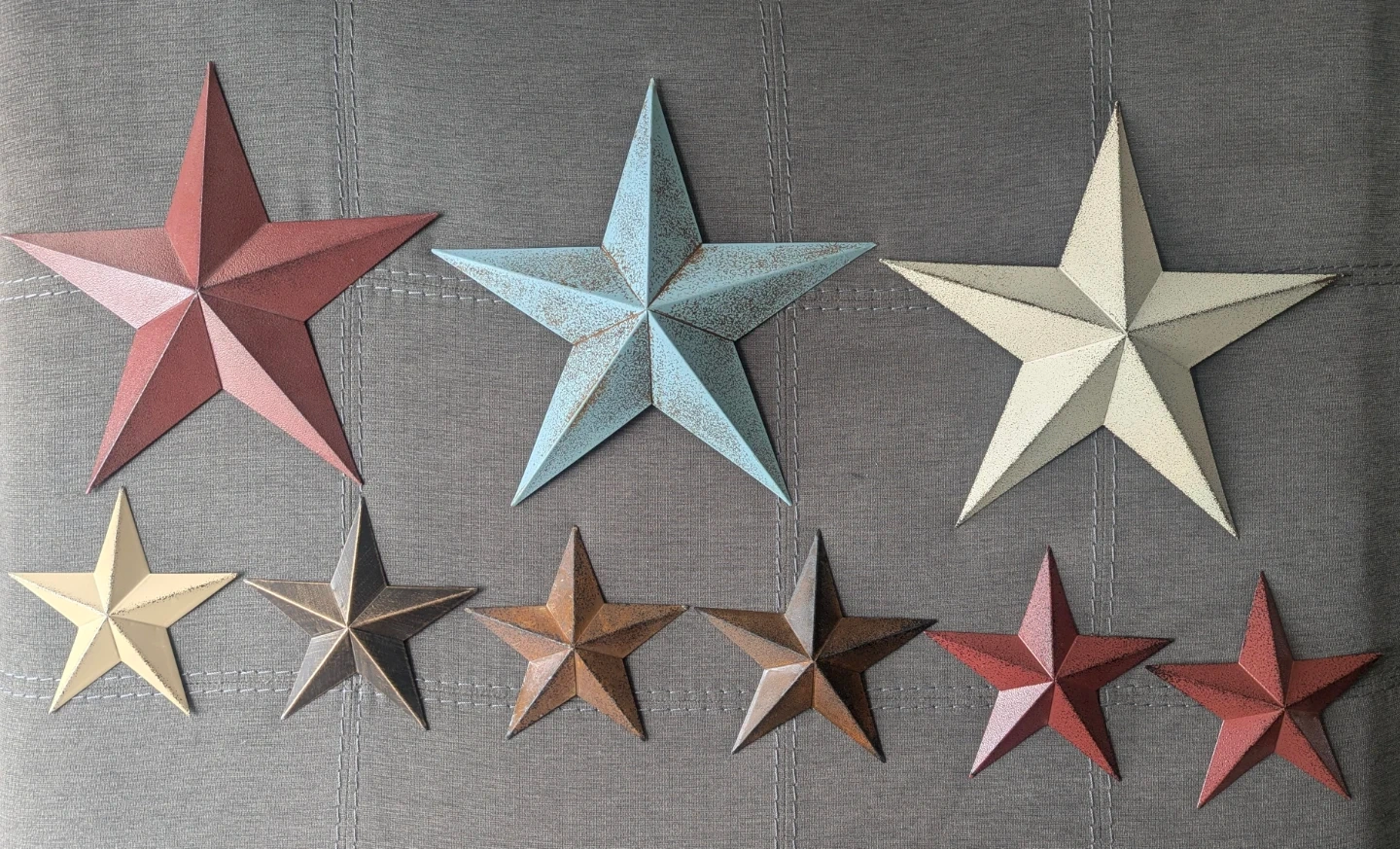 This set includes 8 metal barn stars in various colours and sizes. They're perfect for adding a rustic touch to any wall in your home. The stars are made of metal and feature a distressed finish.