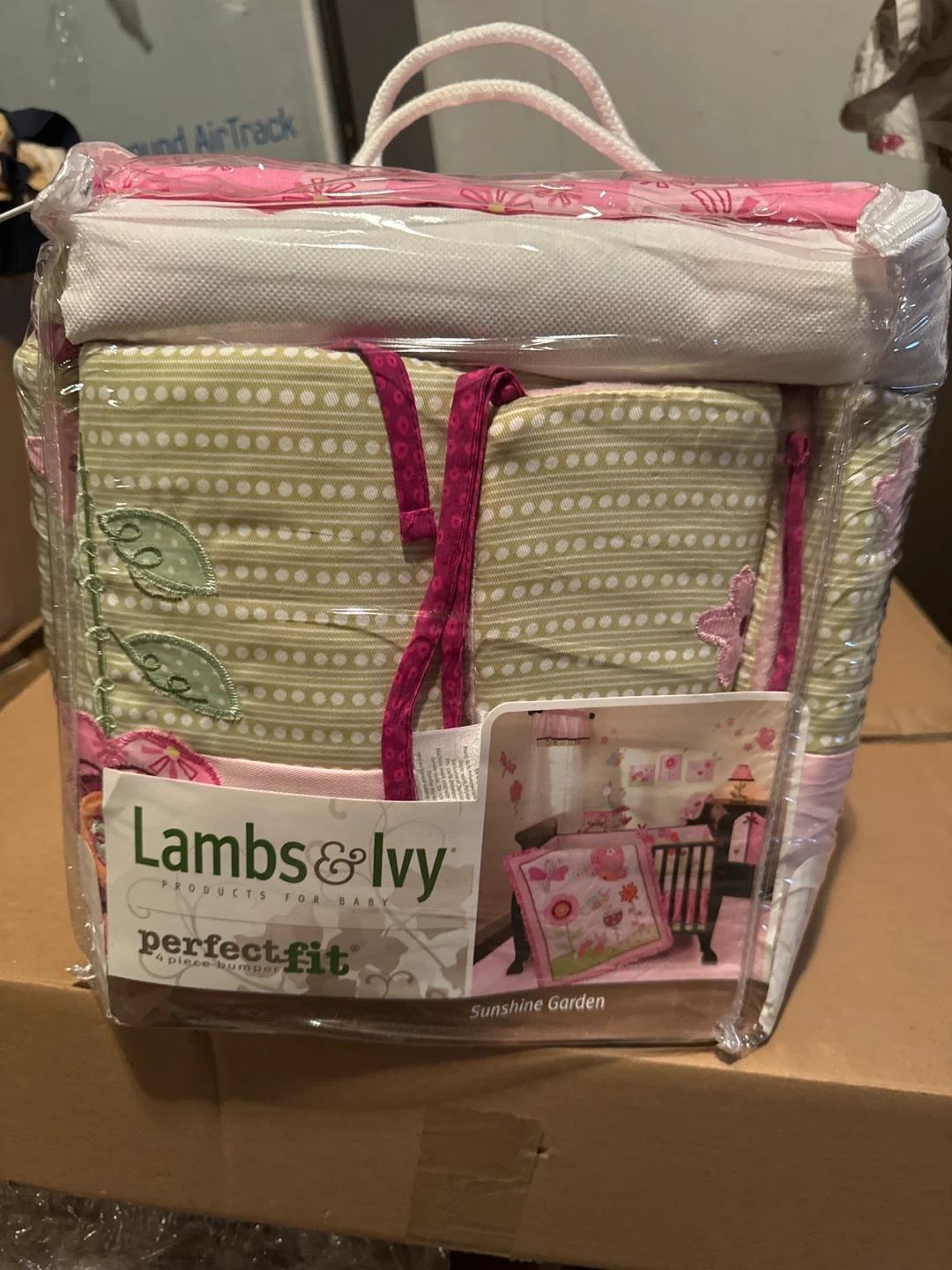 This is a 4-piece crib bumper set from Lambs & Ivy, from their Sunshine Garden collection. It's designed for a crib. It features a lovely green and pink floral pattern.