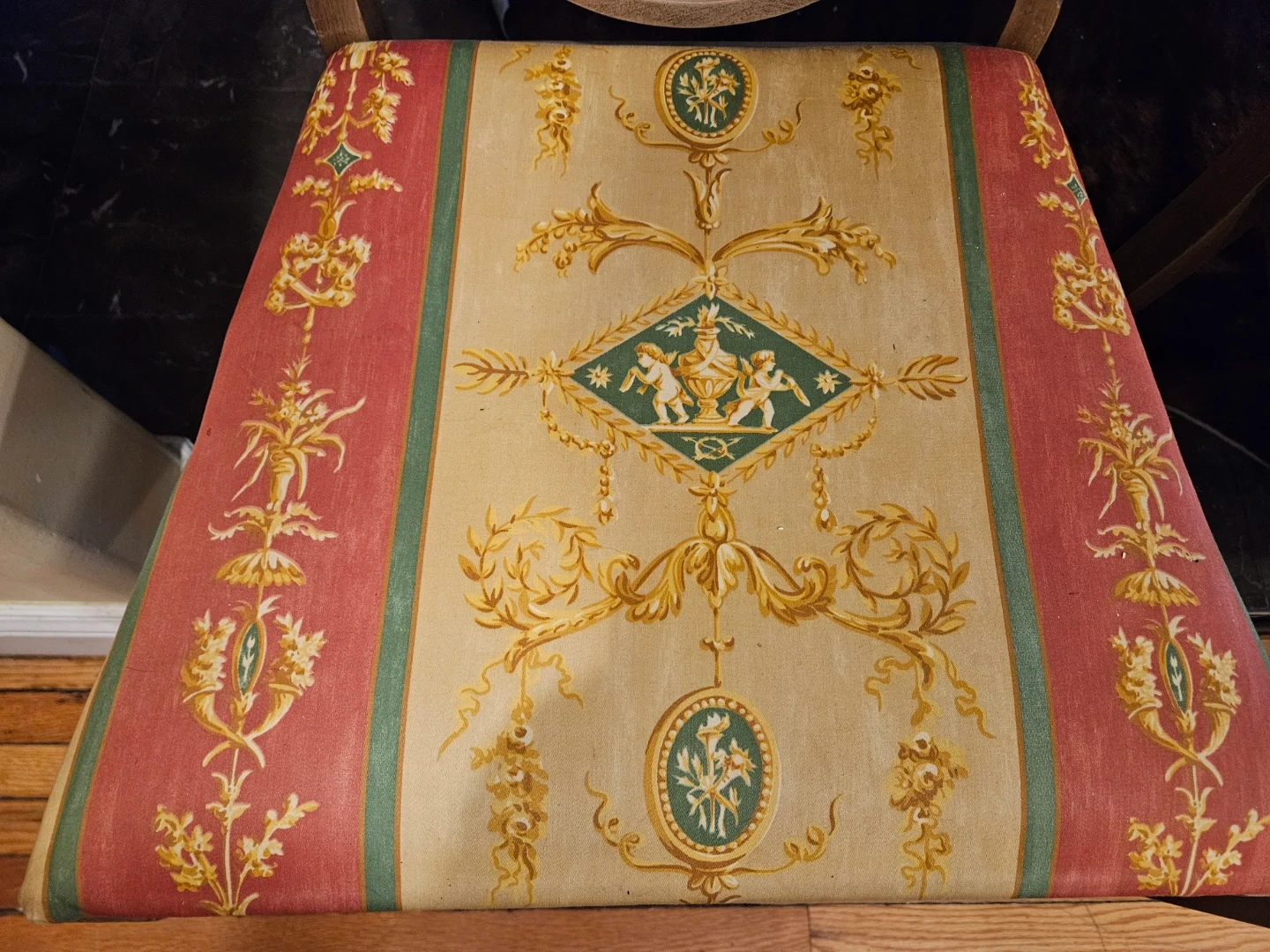 Set of four dining chairs featuring a detailed fabric seat pattern. The wooden frames show some minor wear consistent with age, one has flaw, see photo for detail. These chairs add a touch of classic style to any dining space.