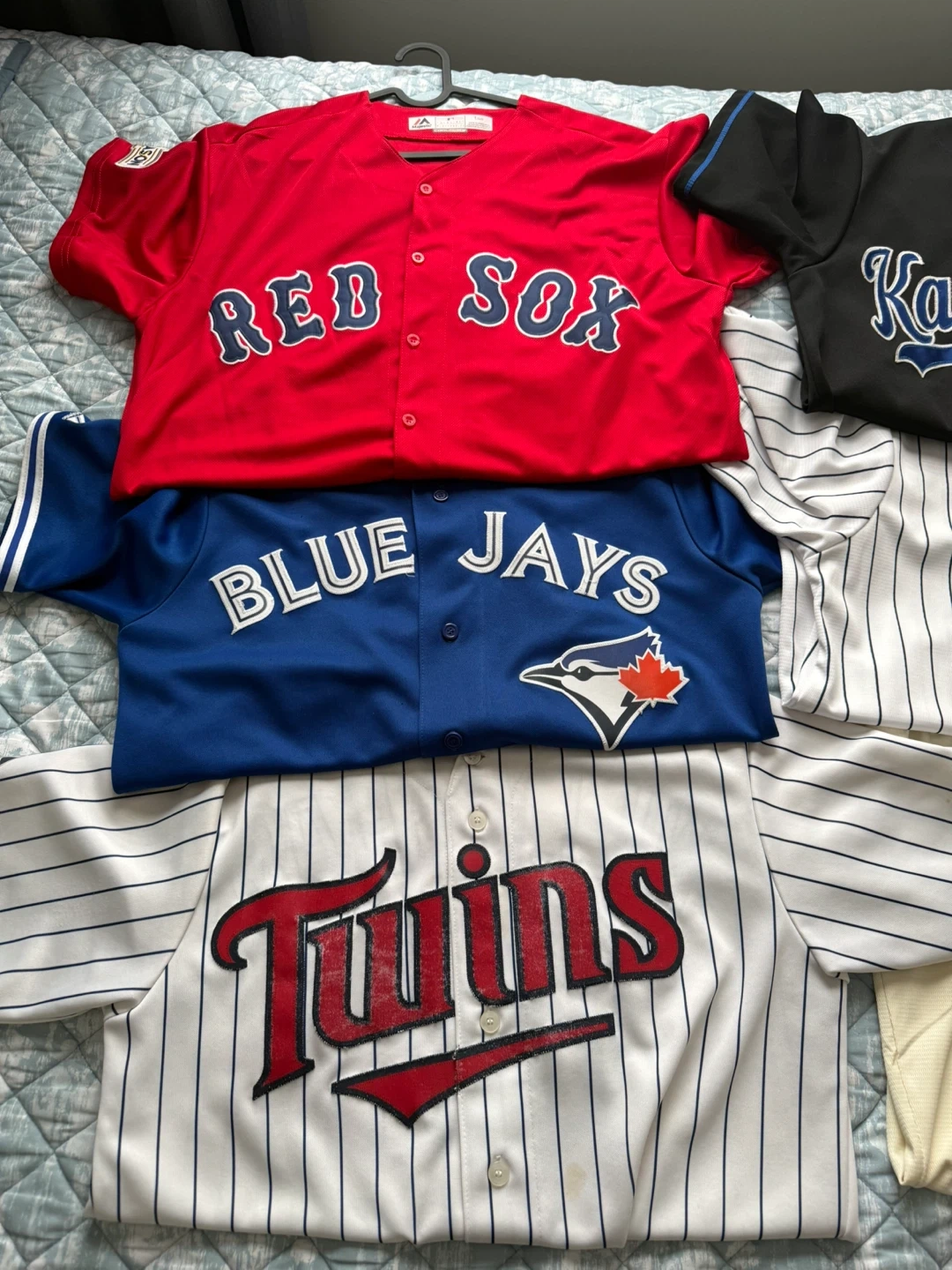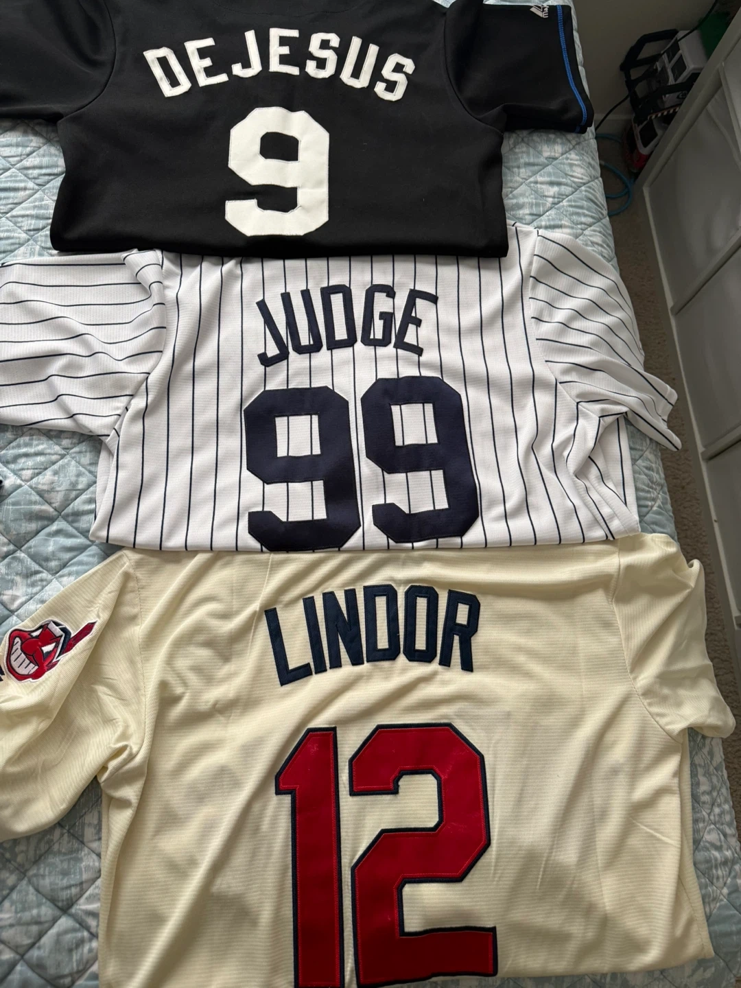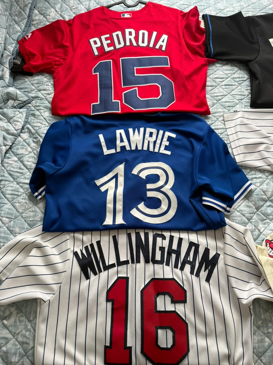 Collection of Majestic brand MLB baseball jerseys. Includes Red Sox, Blue Jays, Twins, New York Yankees, Cleveland Indians, and Kansas City Royals designs. These jerseys feature team names and player names/numbers like Pedroia, Lawrie, Willingham, Judge, DeJesus, and Lindor. Great for any baseball fan!
