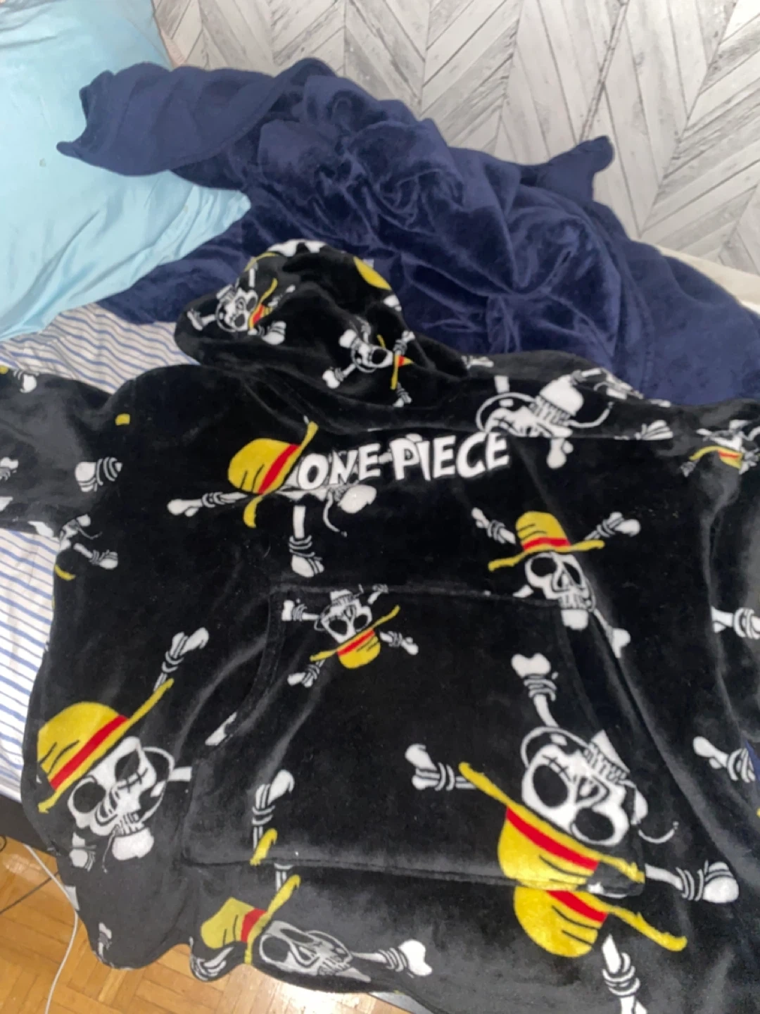 Cozy black hoodie blanket featuring a One Piece skull and crossbones pattern. It has a large front pocket and is made of soft material for ultimate comfort. Perfect for staying warm on chilly evenings!