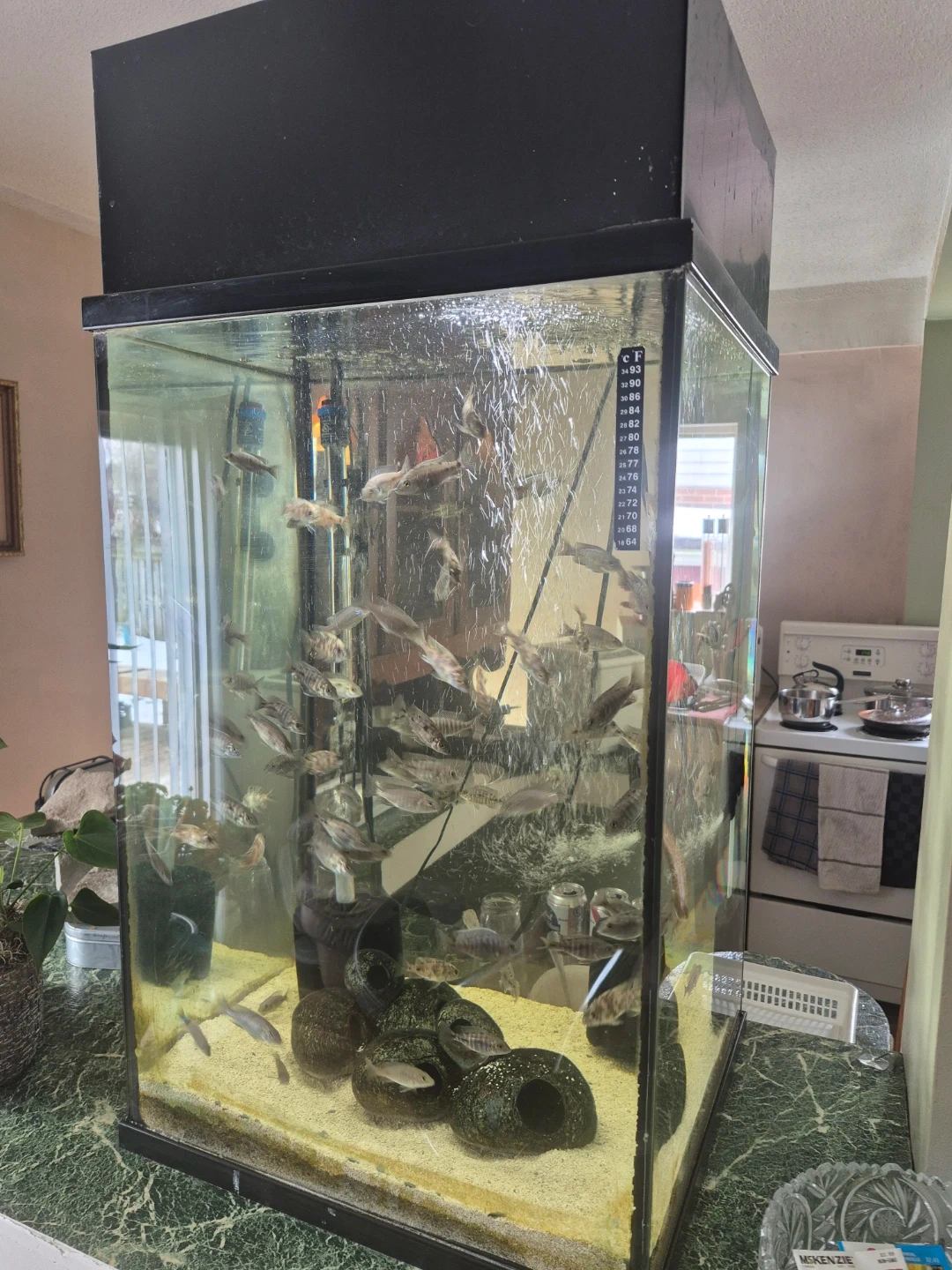 This is a spacious aquarium tank, perfect for housing a variety of fish. It includes a heater and some decorative elements for a comfortable aquatic environment. The tank's dimensions appear substantial, and it's ready for your aquatic pets! Size 18 × 20 × 31