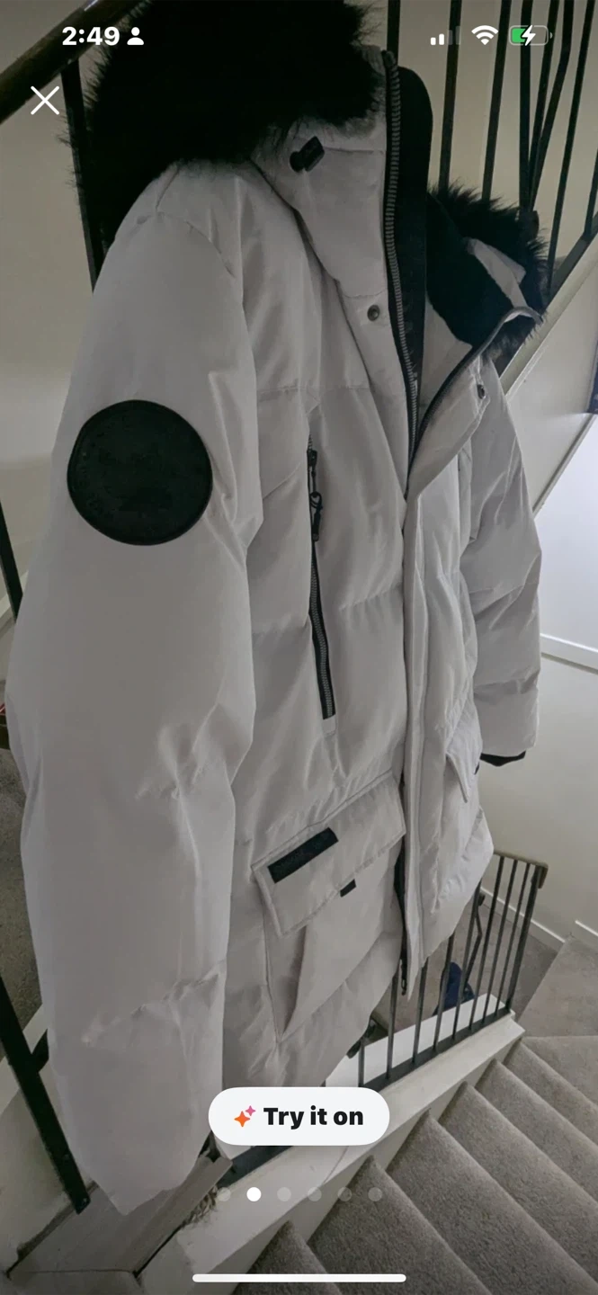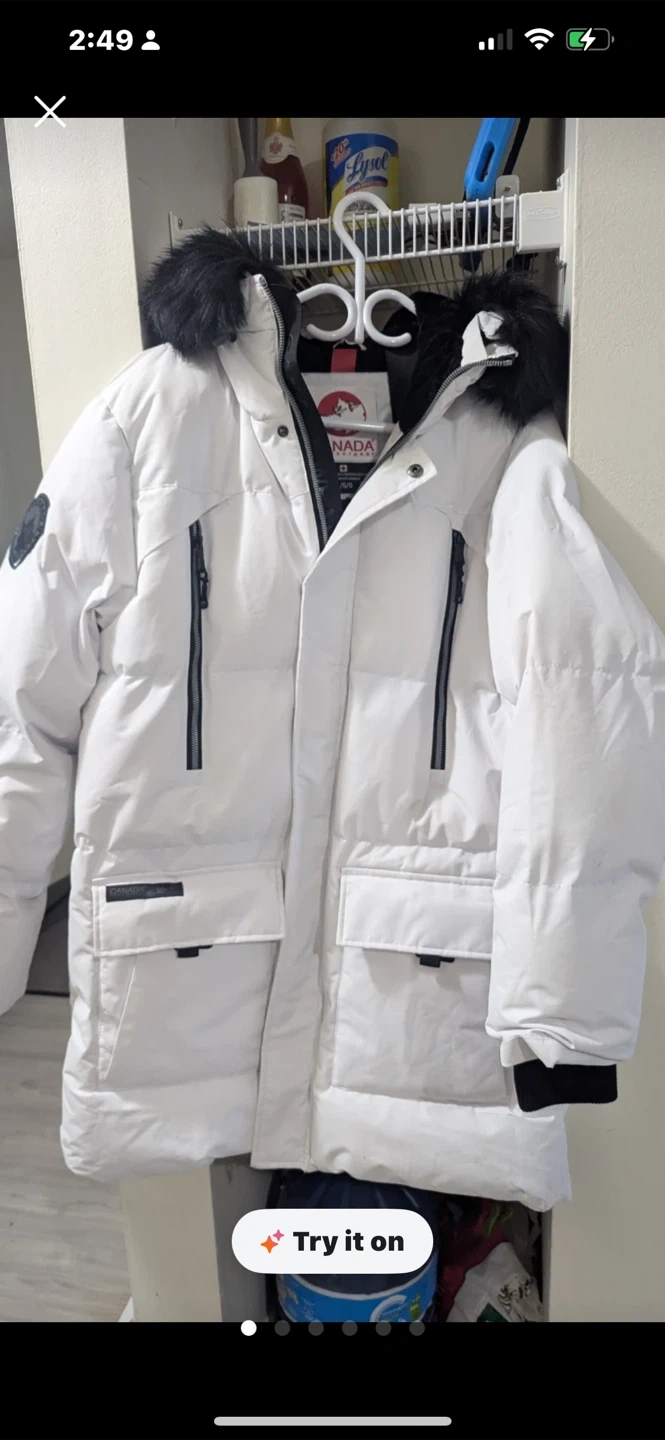 This white puffer parka jacket by Canada Weathergear is a size L/G. It's designed for cold weather with a fur-trimmed hood. It's in great condition! Very beautiful just to small to my husband