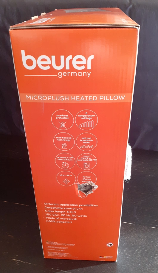 New in box Beuer Microplush Heated pillow with 6 temperature settings, 12x16 inches, equipped with an overheating safety system.