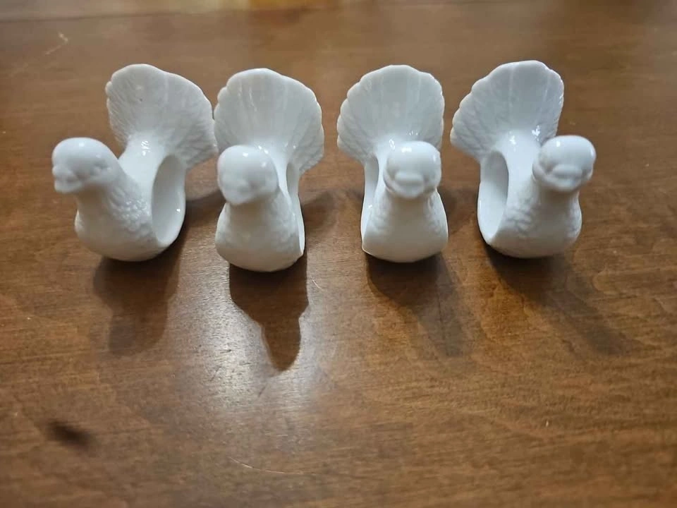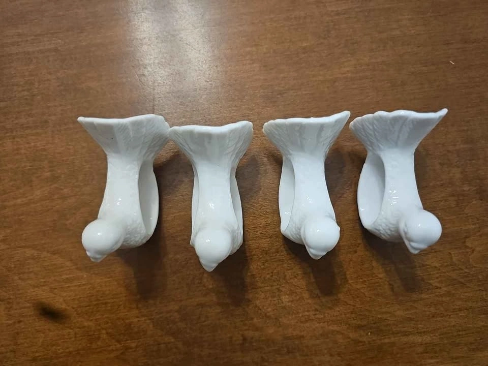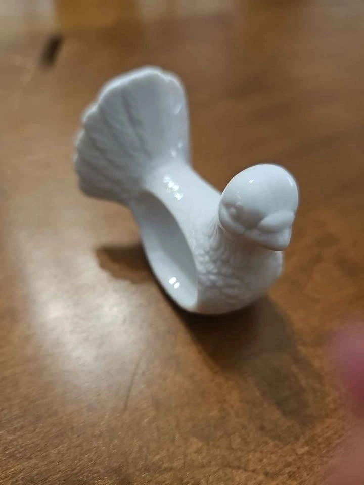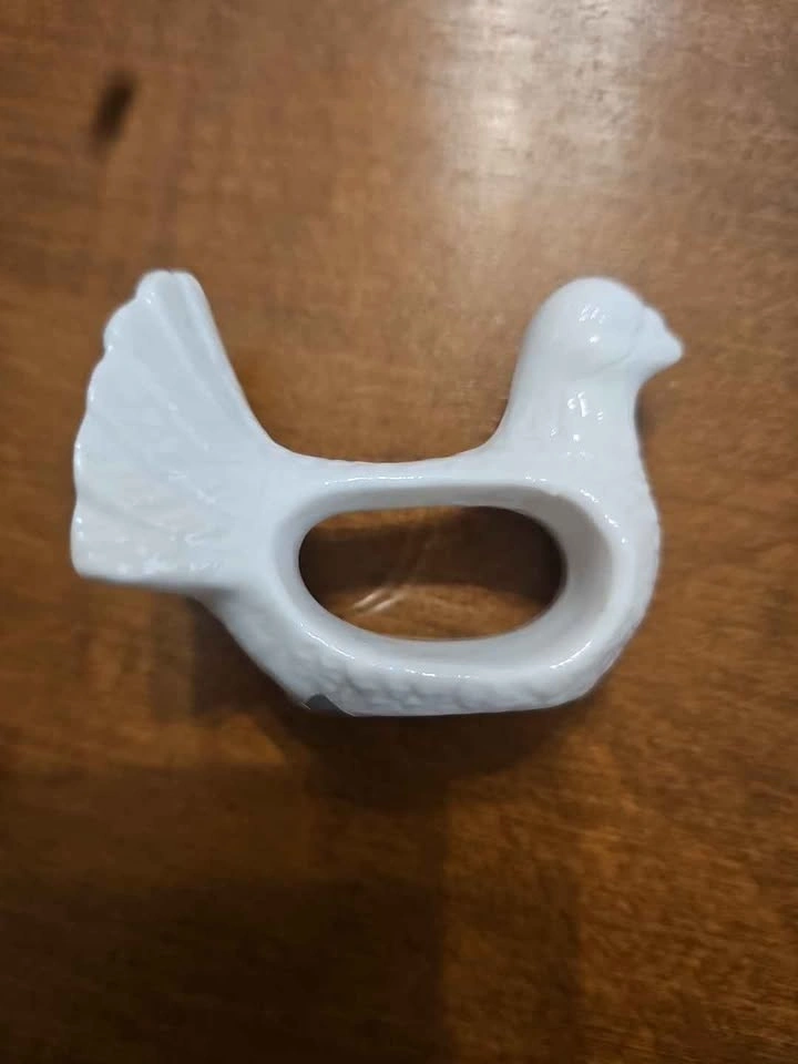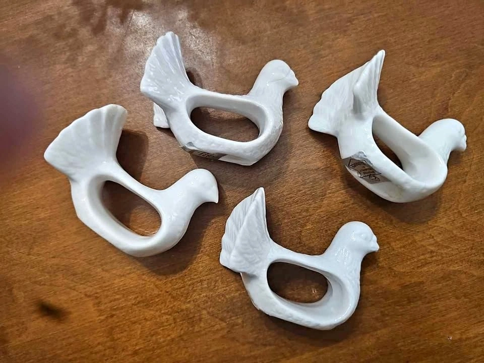 Beautiful set of 4 white ceramic dove napkin rings. Gloss finish with lovely feather detail. Perfect for spring tables, Easter, weddings, or farmhouse-style decor. In excellent condition. No chips or cracks. Approx. 3" long x 2" high. Super cute for hosting or gifting! $25 for the set. Pick up 208 & 57 Langley.