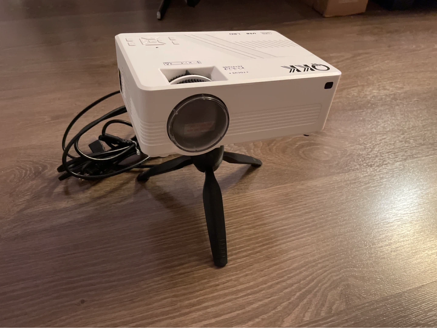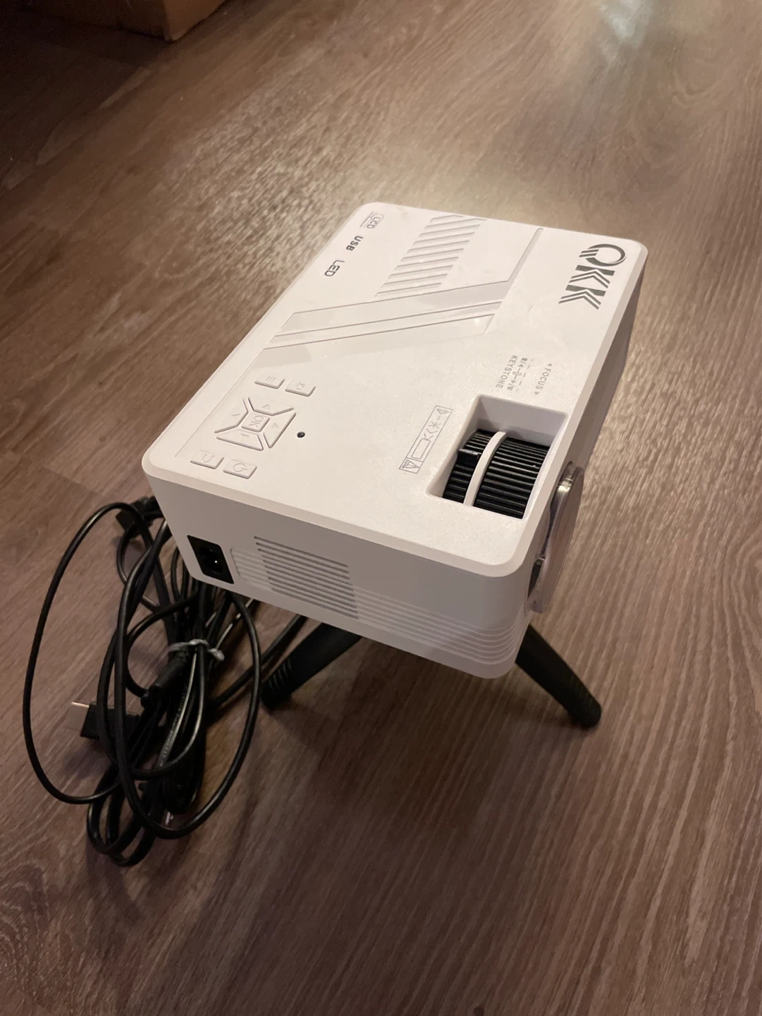 White KK brand portable projector. Supports LCD, USB, and LED inputs. Includes a small tripod for placement. Perfect for setting up a movie night anywhere!