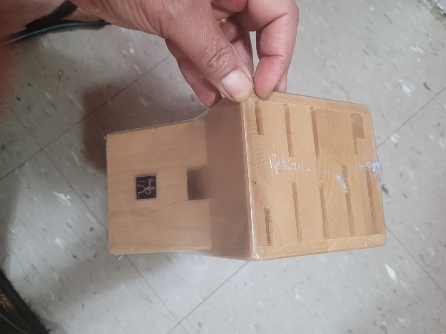 This is a wooden knife block with 10 slots. It's designed to keep your kitchen knives organized and accessible. The block is made of natural wood.