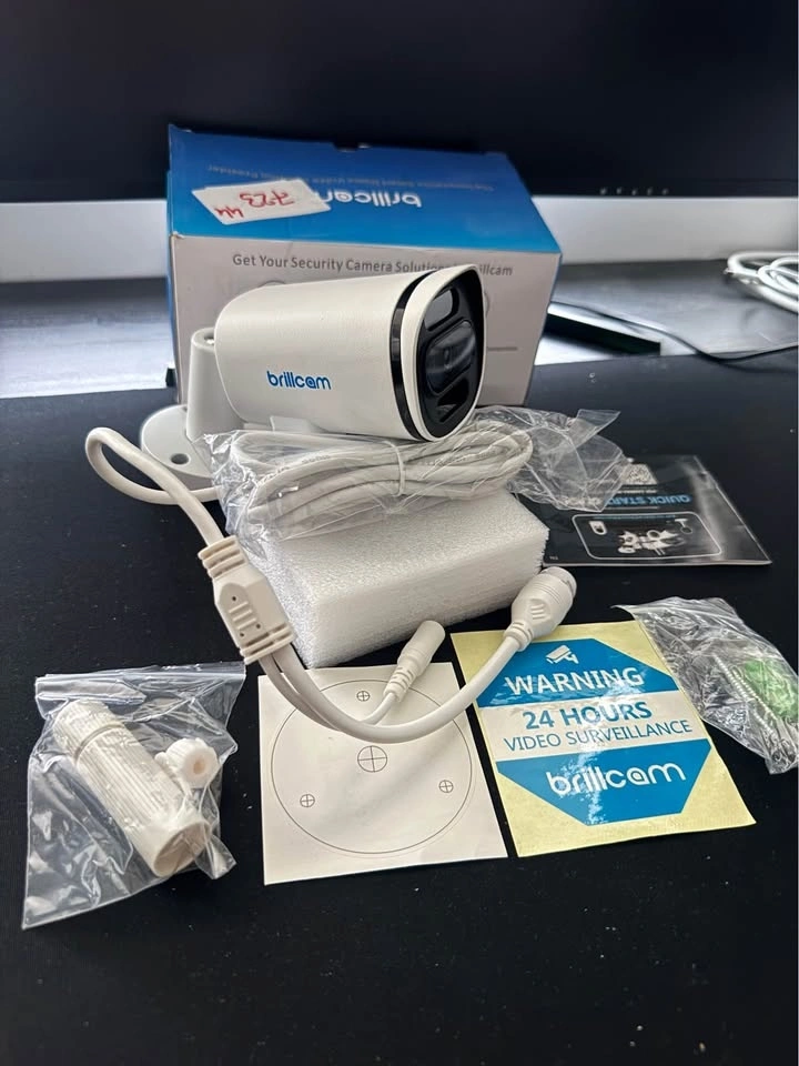 This is a new Brillcam security camera, still in its original box. It comes with the camera, cables, mounting hardware, warning sticker, and quick start guide.